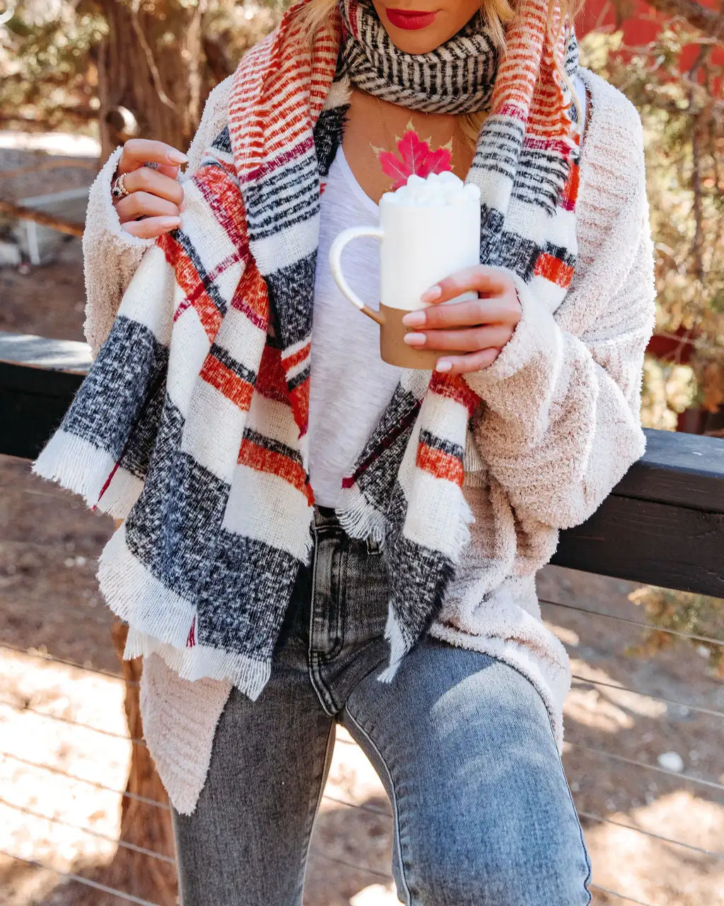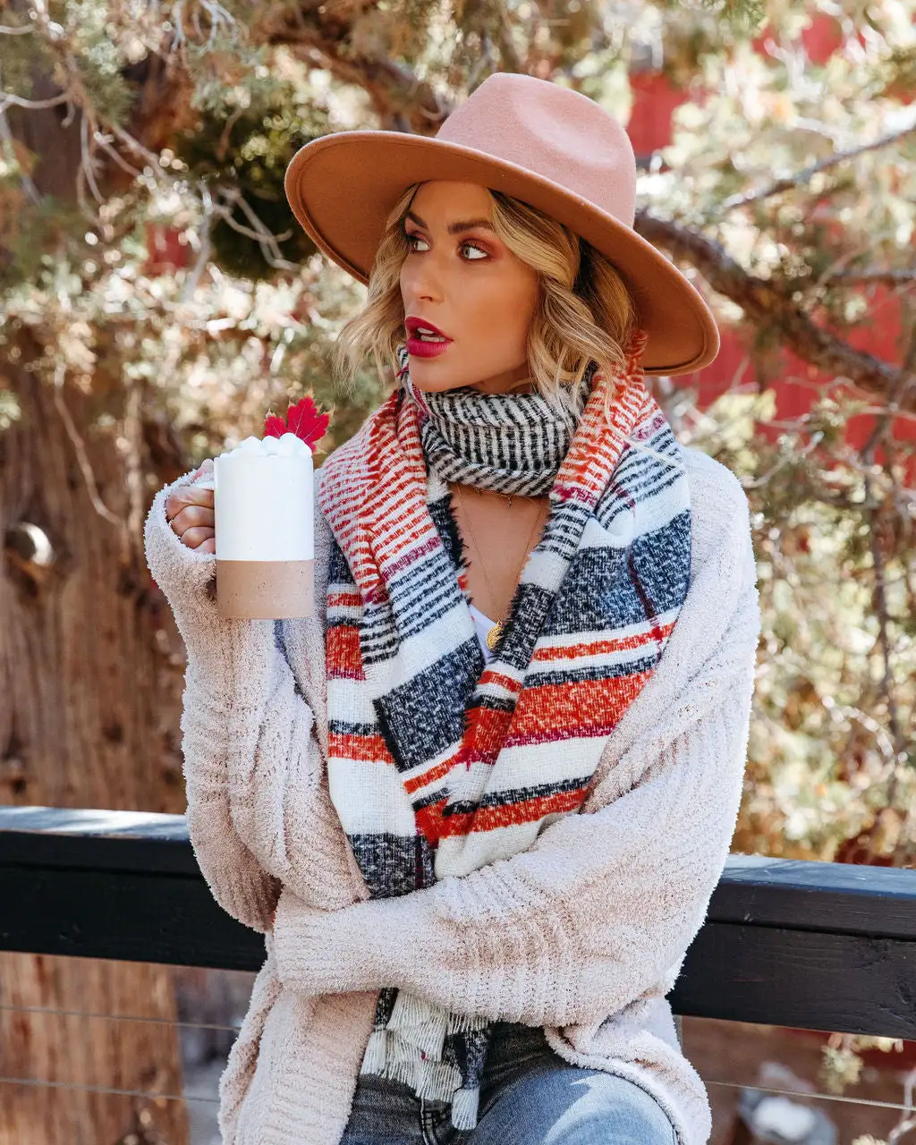 Like a warm hug for your neck! Our Jenesis Striped Scarf features black, orange, burgundy, and ivory hues. Designed with frayed edges. Made in the softest knit ever! Styled with the El Dorado Hat, The Buddha Wheel Necklace, Physique Racerback Tank, and Thorn Soft Knit Cardigan.