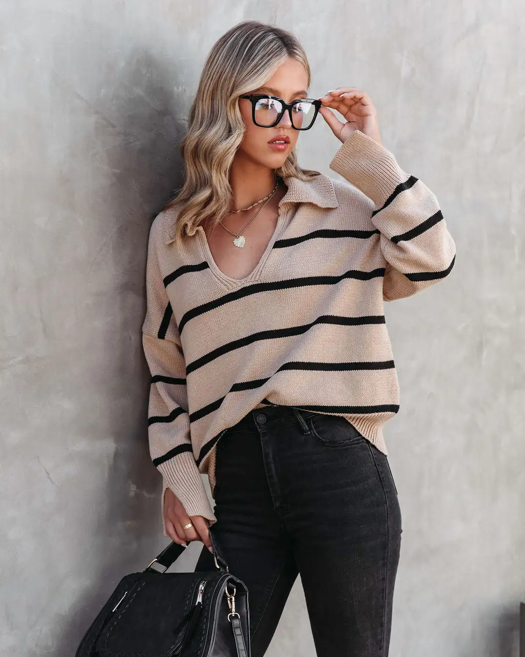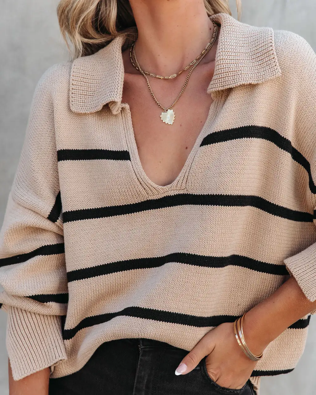 We’re loving the preppy vibes of the Jessie Striped Knit Collared Pullover Sweater in brown and black that features a split neckline.