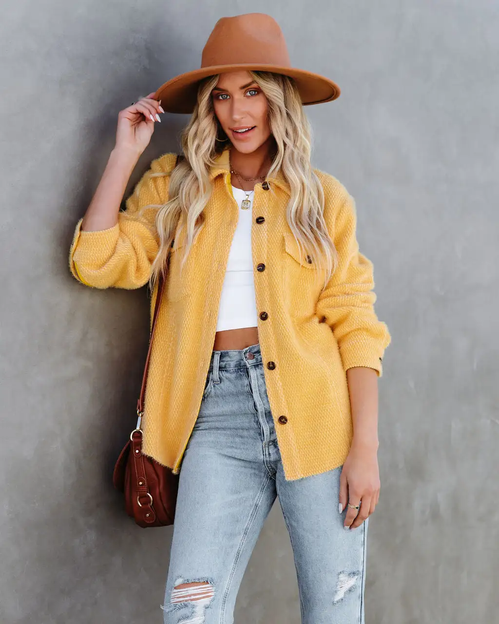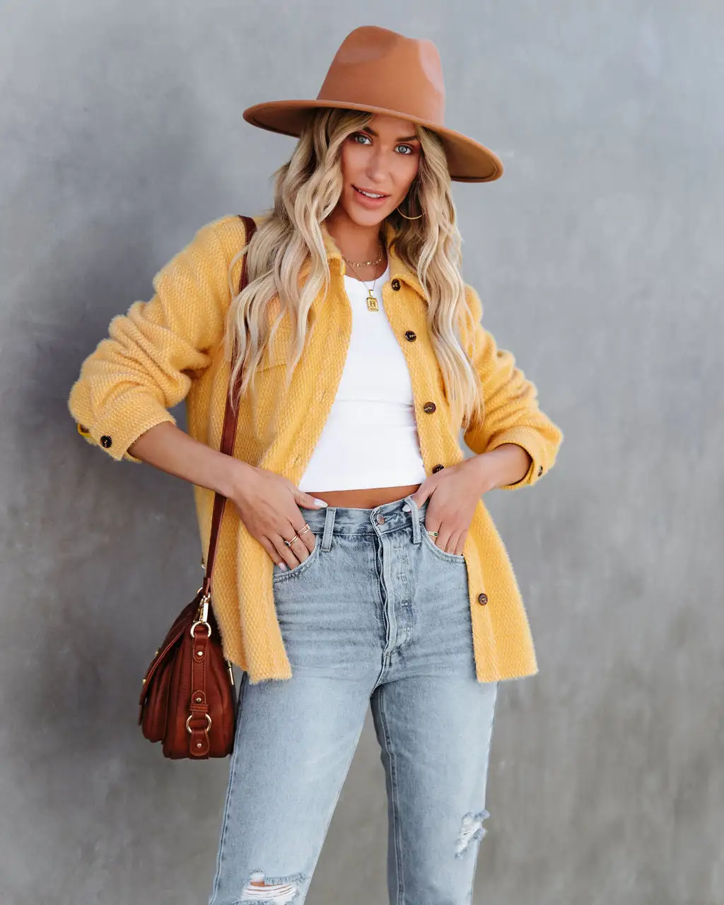 Invite color into your wardrobe in our Jessika Button Down Soft Knit Shacket! This bright yellow shacket is secured with front button closures. Designed with bust pockets and button cuffs. Styled with the El Dorado Hat, Perfect Hoop Earrings, Chloe Mini Necklace, Initial Card Necklace, Simple Bangle Bracelet, Kiki Knit Crop Top, Lizzie Faux Leather Crossbody Bag, Kason Distressed High Rise Denim, and Jocelyn Heeled Bootie.