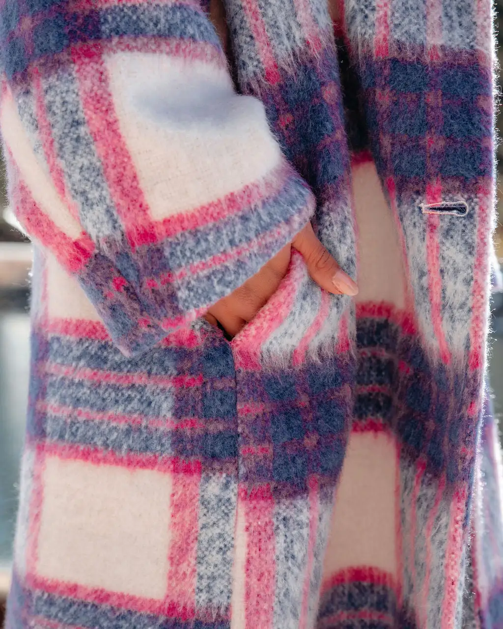 Our Jolie Pocketed Plaid Coat is a statement maker! Bold hues of blue, hot pink, and ivory detail this coat. Crafted with a notched collar and side pockets. Finished with front button closures. Styled with the El Dorado Hat, Tahiti Hoops, Kenzie Backpack, September Mock Neck Ribbed Knit Top, Kason Distressed High Rise Denim, and Uptown Faux Suede Heeled Bootie.