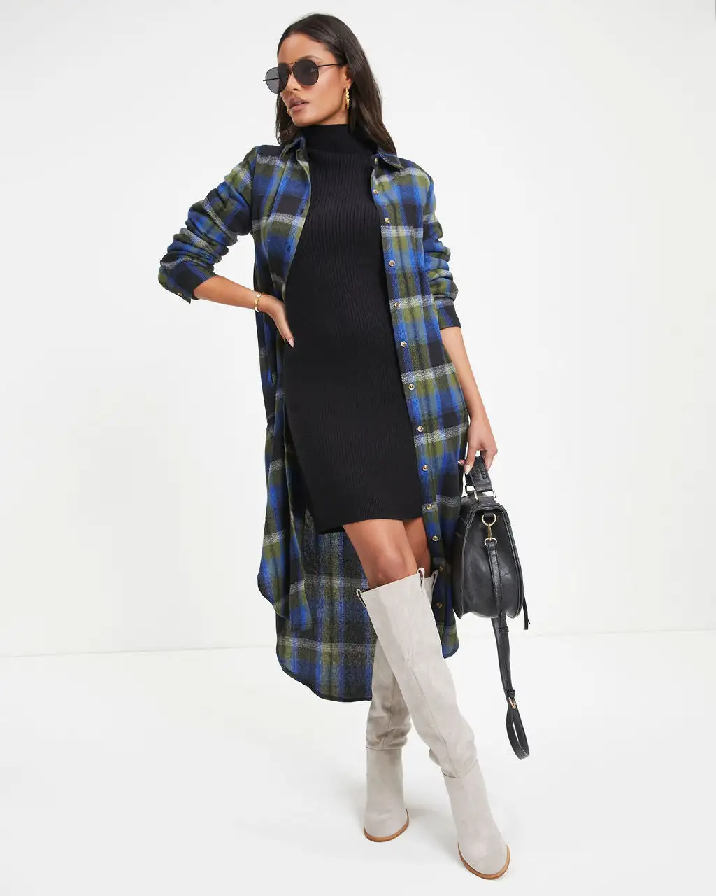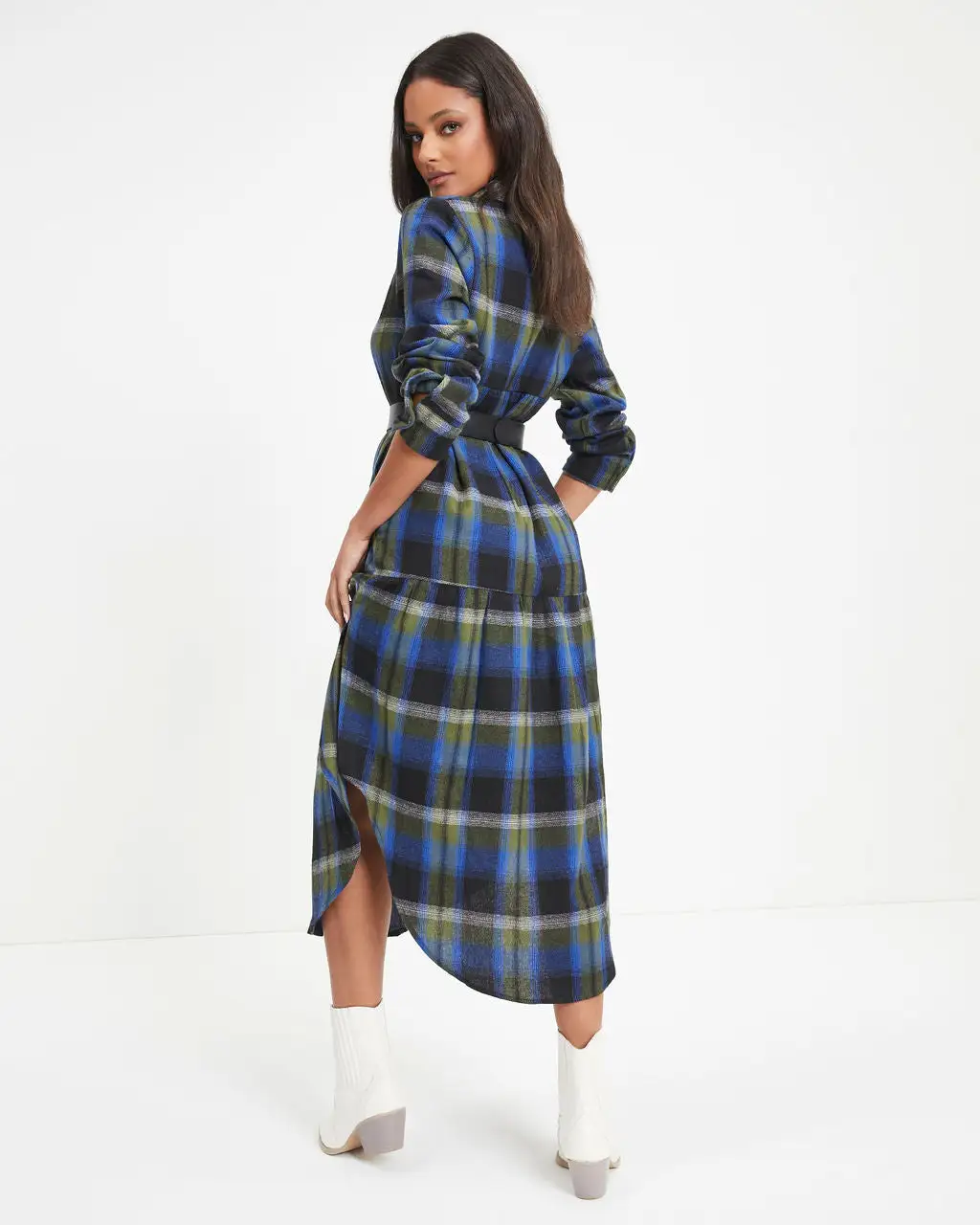 Go to the pumpkin patch in the Jonathan Pocketed Plaid Button Down Midi Dress in green and blue that features front button closures.