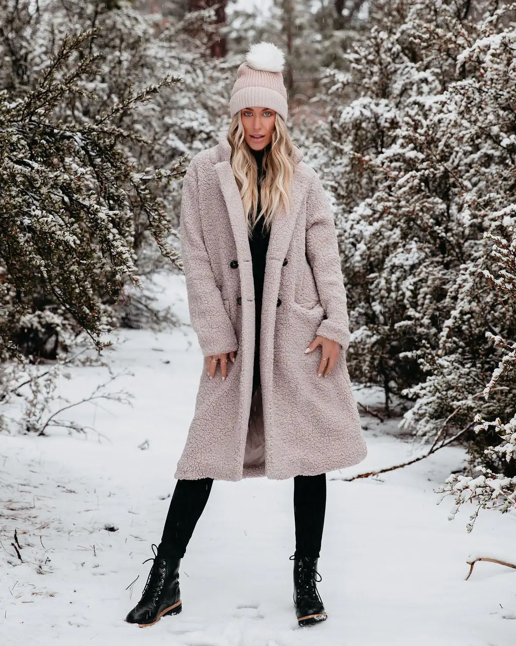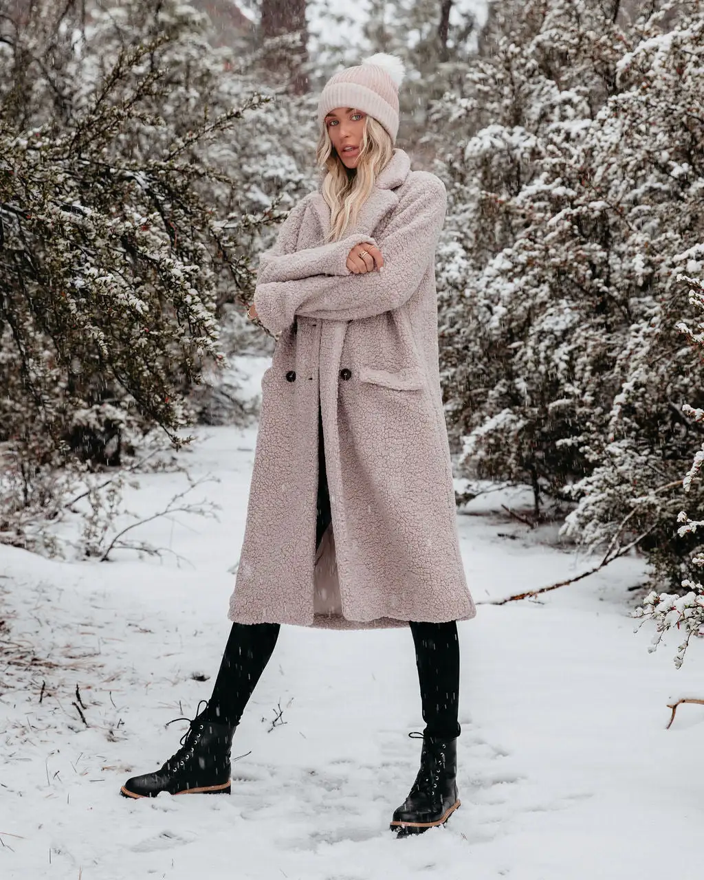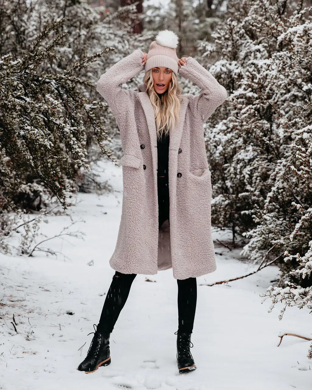 Our Just Imagine Sherpa Pocketed Trench Coat is ready for colder weather! This grey colored coat is secured with front button closures. Designed with front pockets and a notched collar. Styled with the Eden Pom Beanie, Day To Day Turtleneck Knit Top, Orion High Rise Distressed Skinny, and Brycen Faux Leather Lace Up Boot.