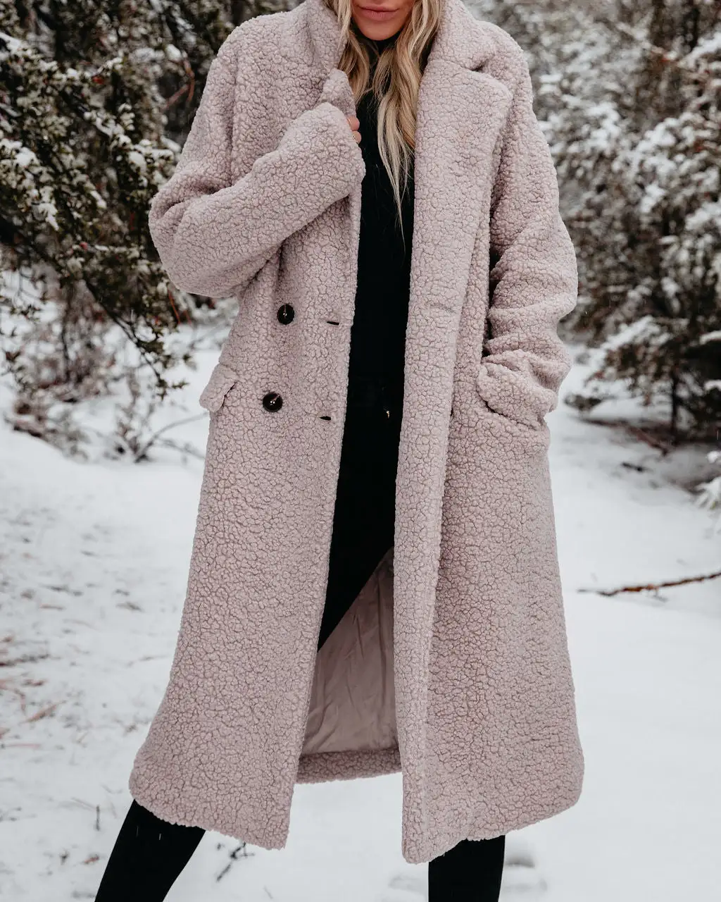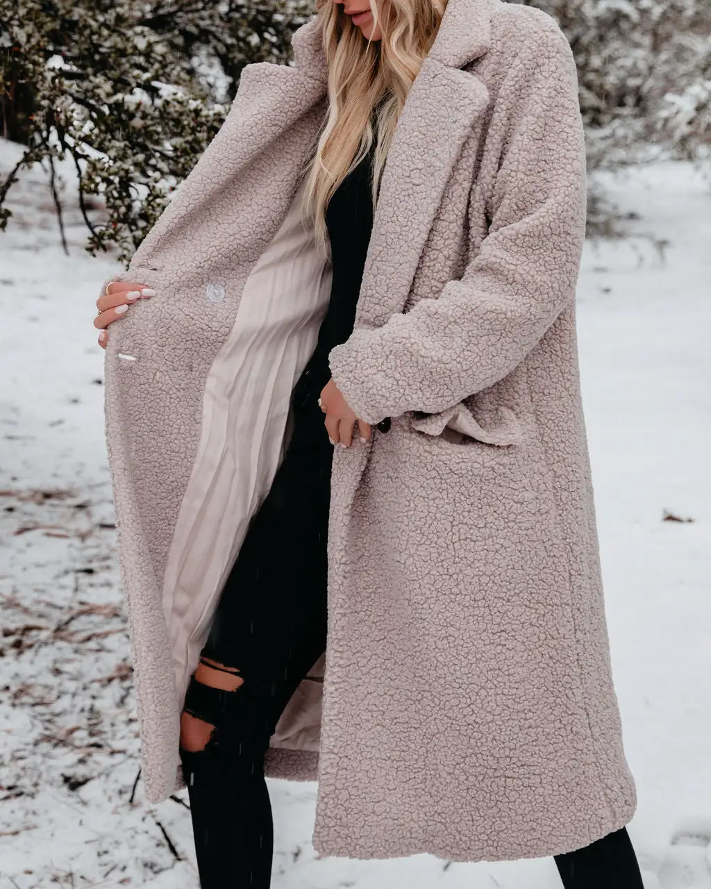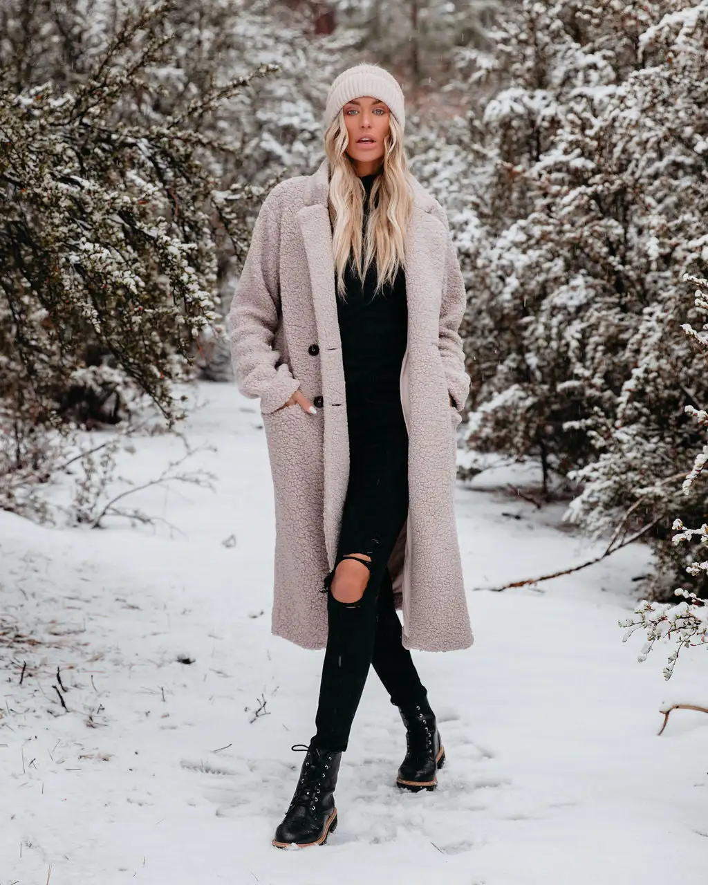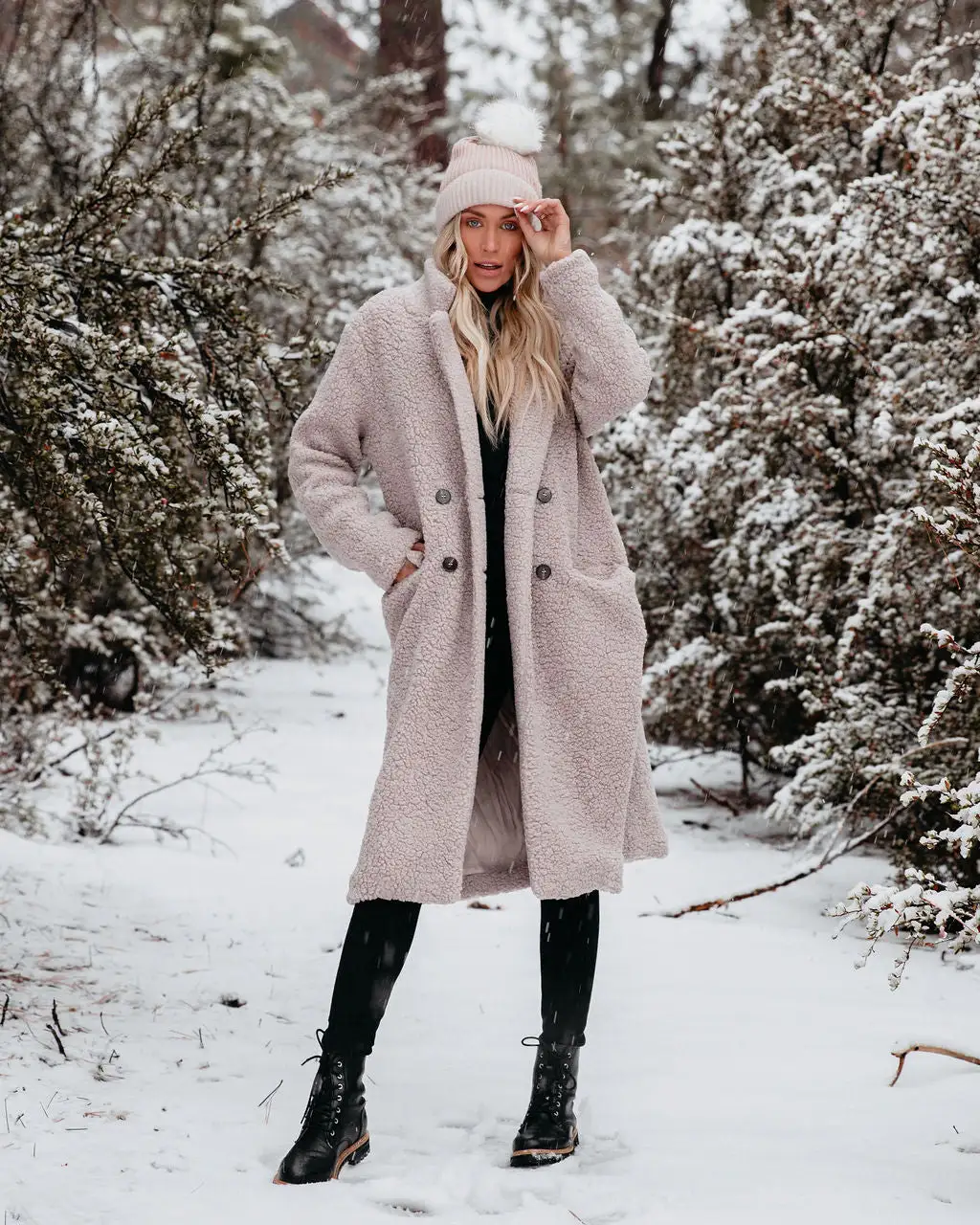 Our Just Imagine Sherpa Pocketed Trench Coat is ready for colder weather! This grey colored coat is secured with front button closures. Designed with front pockets and a notched collar. Styled with the Eden Pom Beanie, Day To Day Turtleneck Knit Top, Orion High Rise Distressed Skinny, and Brycen Faux Leather Lace Up Boot.