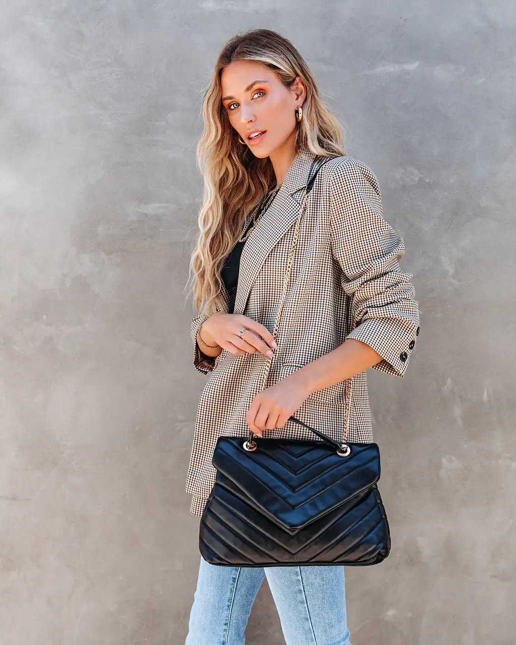 Quilted purses are so chic! Our Kaisley Quilted Crossbody Shoulder Bag comes in black vegan leather. Designed with gold hardware and a snap button closure. The inner is fabric lined.