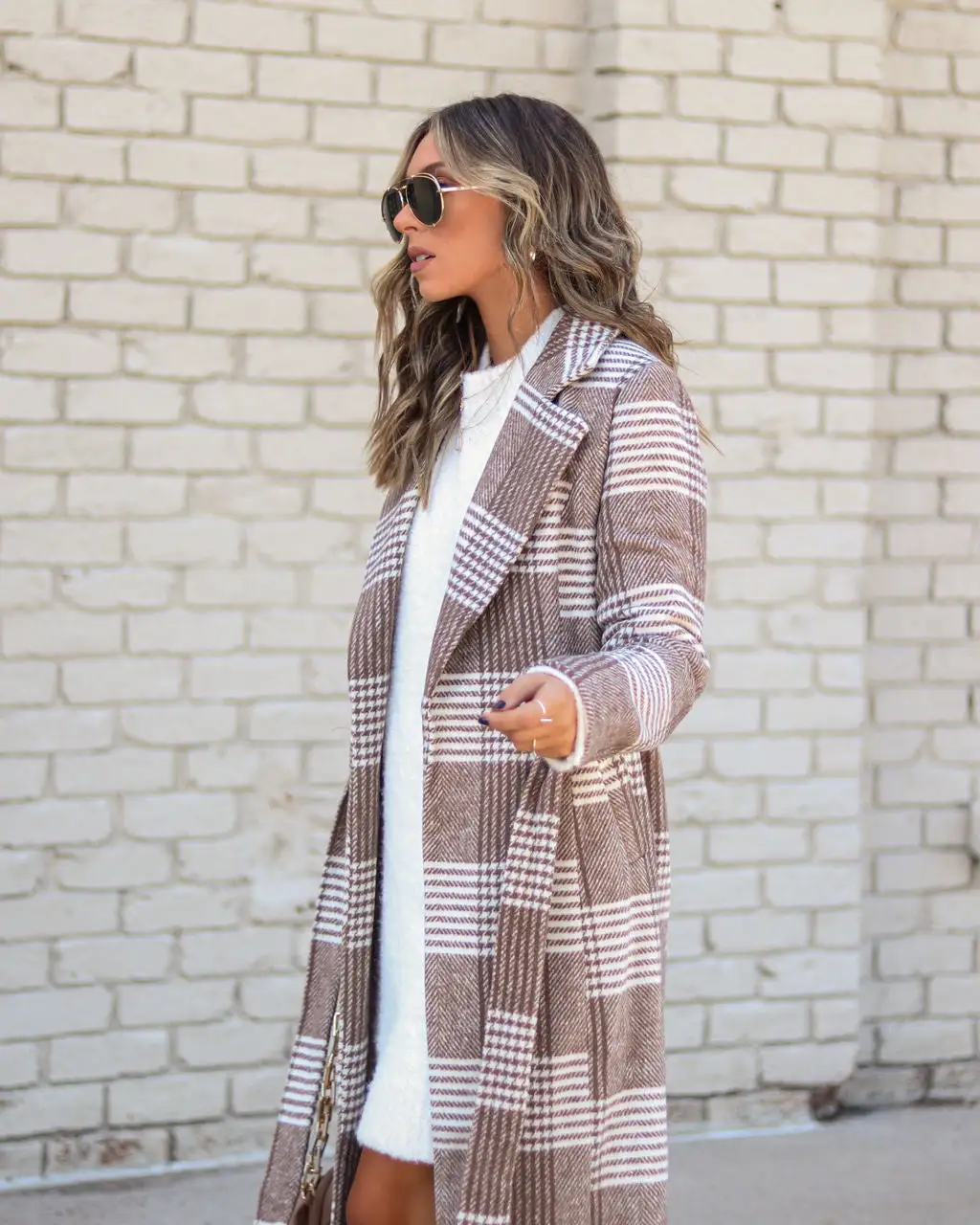 Upgrade your outerwear in the Keeping It Real Pocketed Plaid Coat in brown multi that features a lower back vent.