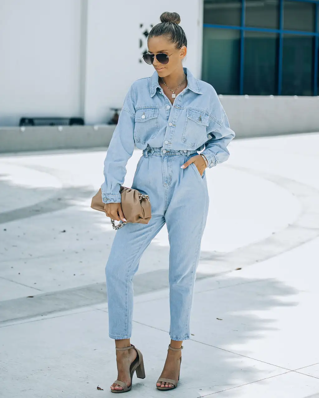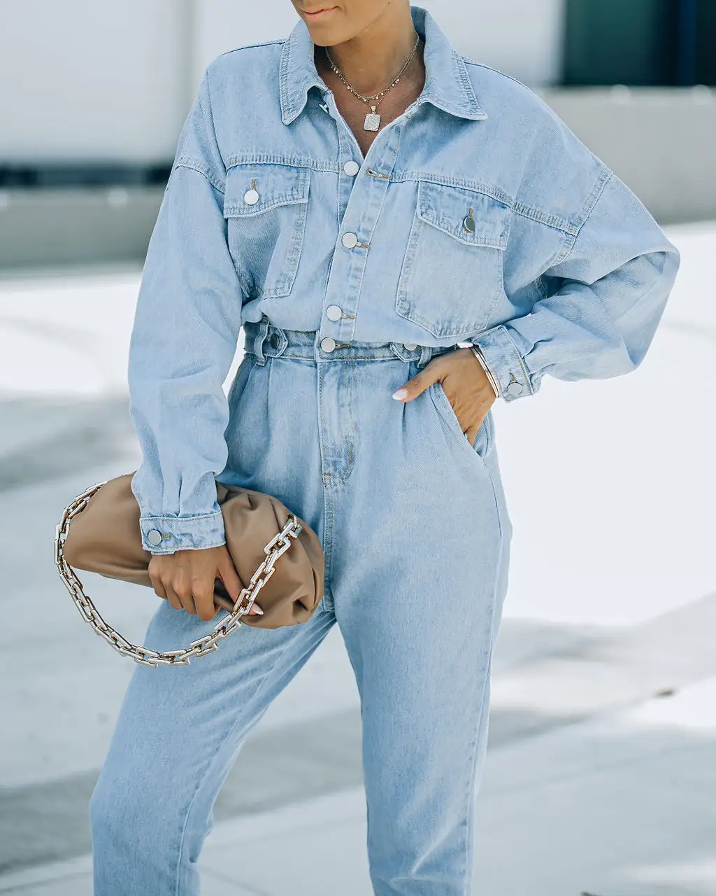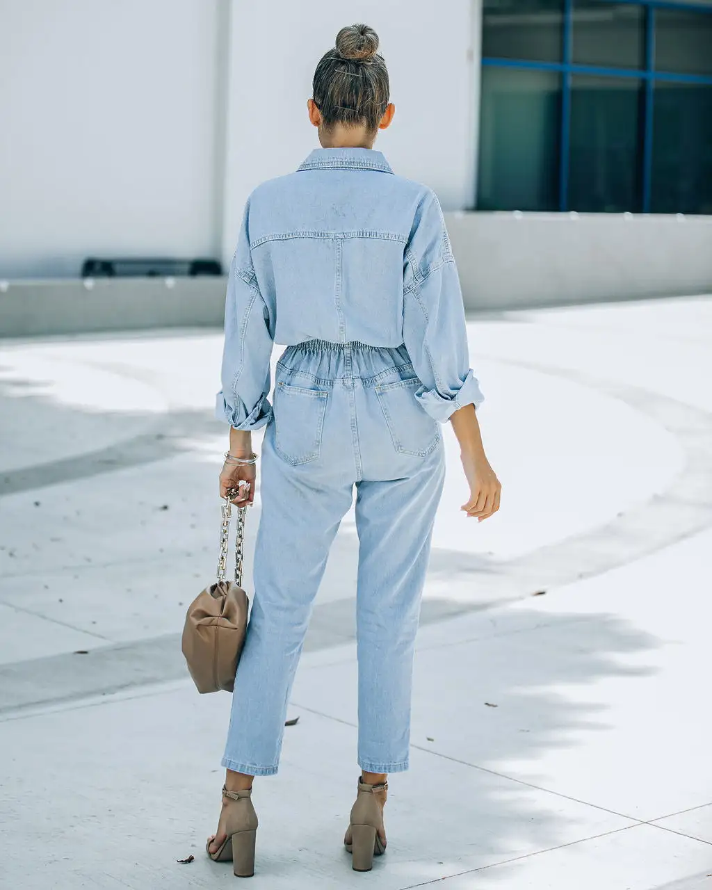 A must-have for Fall, the Kendall Pocketed Denim Jumpsuit in light wash denim features a straight leg.