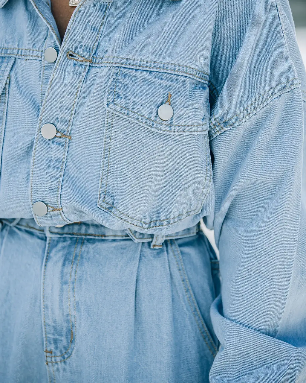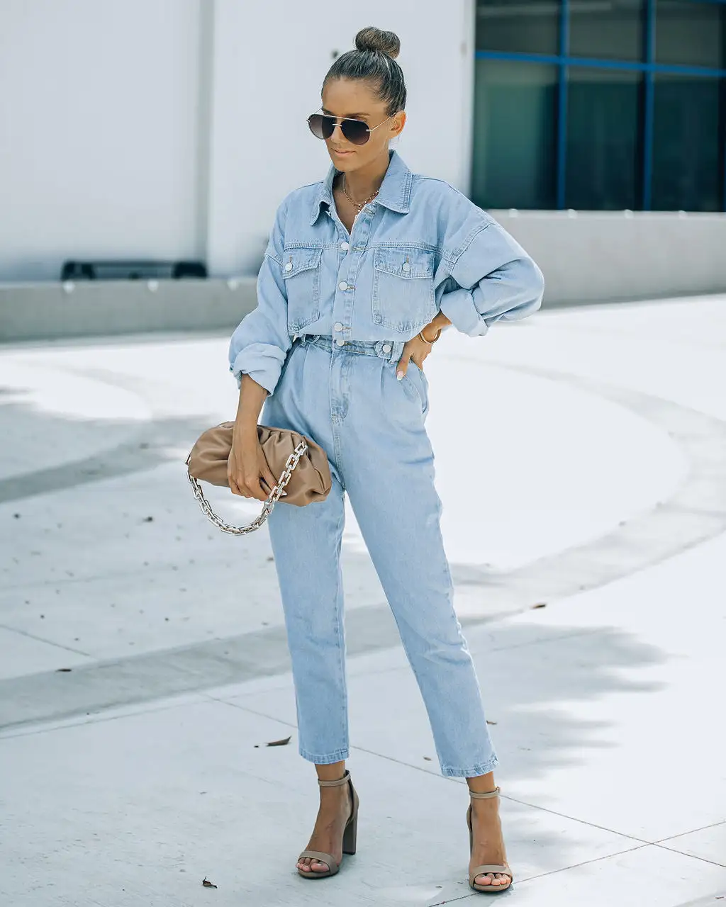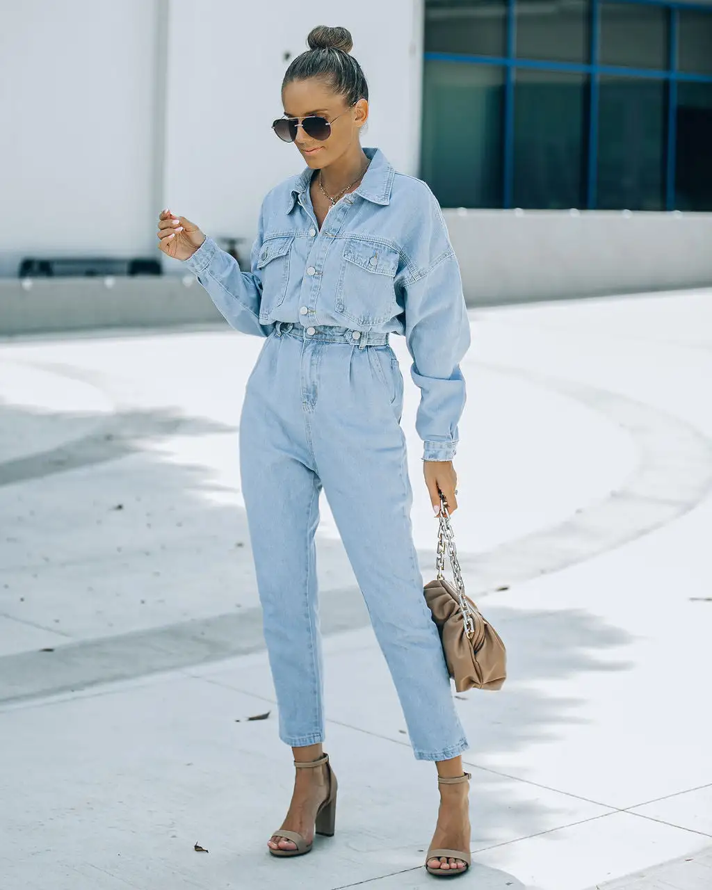 A must-have for Fall, the Kendall Pocketed Denim Jumpsuit in light wash denim features a straight leg.