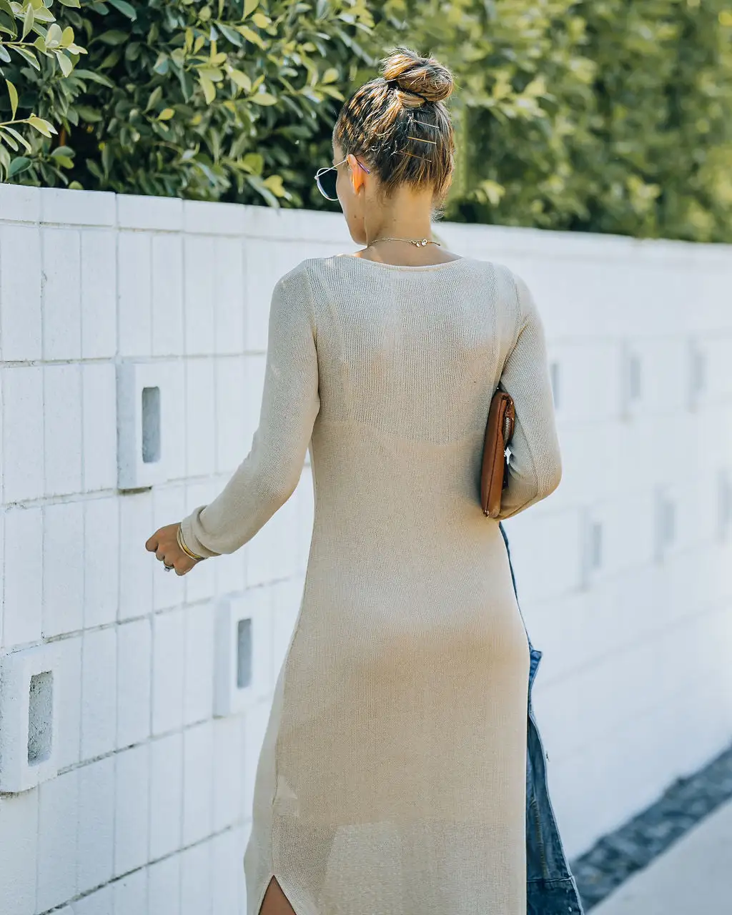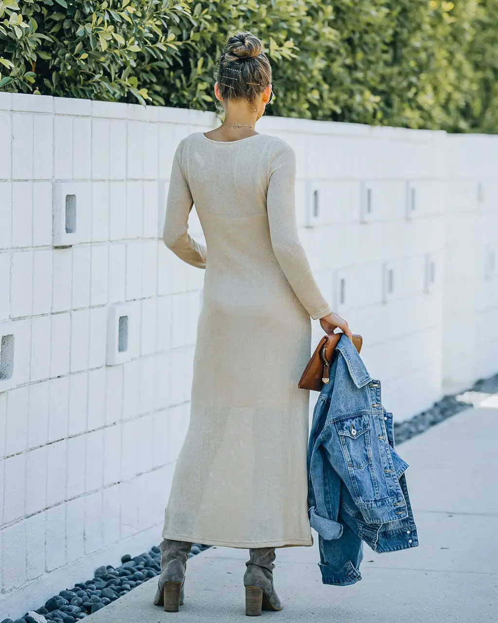 Our Kenji Long Sleeve Knit Midi Dress is a cold weather classic! This oatmeal long sleeve knit midi features a 14 inch side slit. Designed with a removable slip lining in a midi length. Styled with the Chloe Mini Necklace, Compass Coin Necklace, Simple Bangle Bracelet, Stella Crossbody Envelope Zip Clutch, High Road Cropped Denim Jacket, Sara Faux Suede Heeled Slouch Boot.