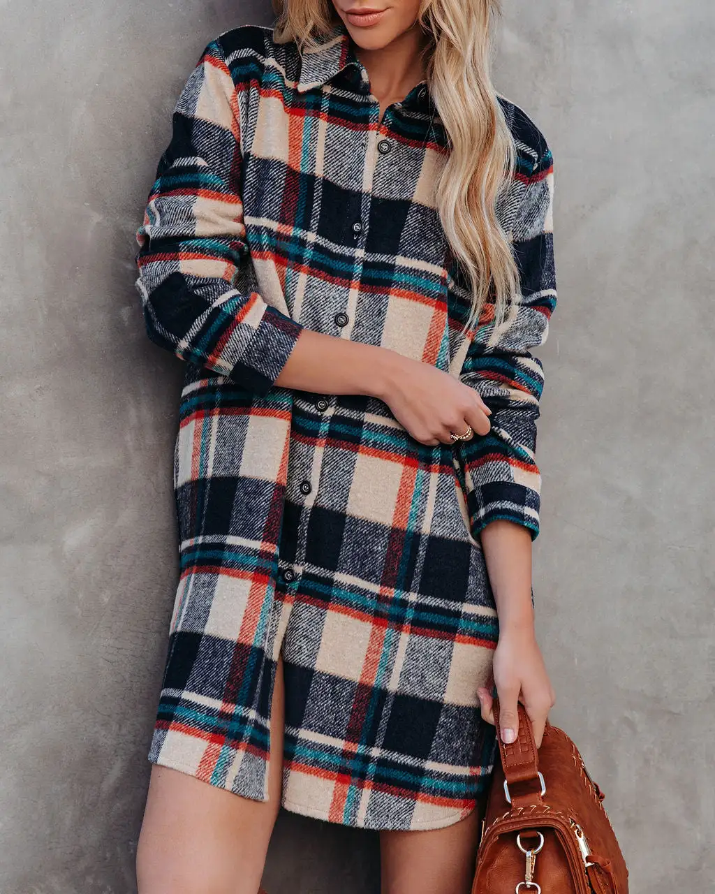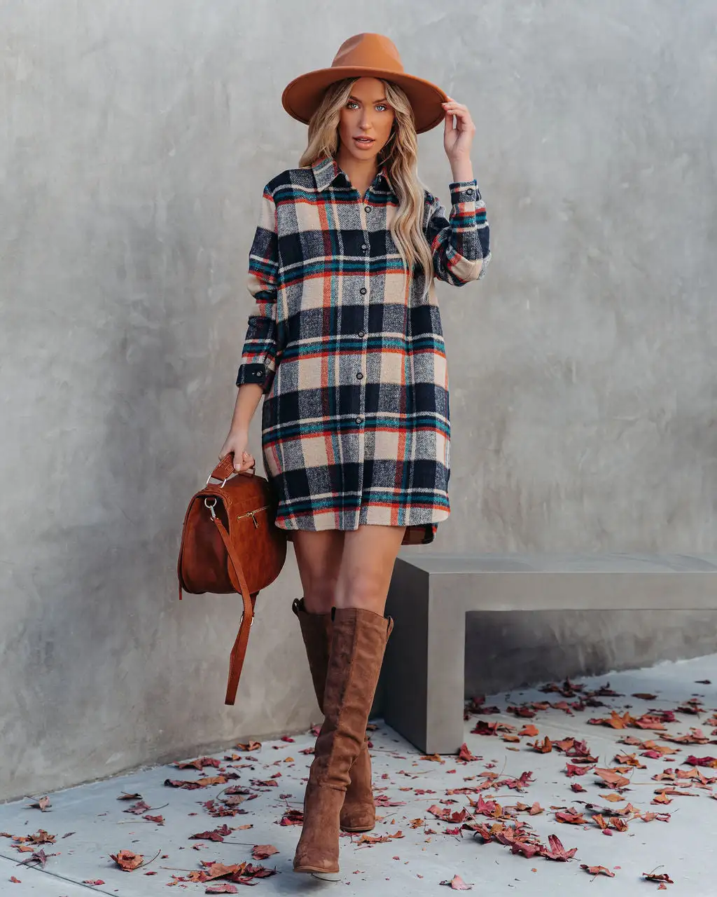Our Kenyon Pocketed Plaid Button Down Shacket looks cute when worn as a dress! Navy, teal, orange, and beige plaids detail this oversized piece. Designed with front button closures and side pockets. Styled with the El Dorado Hat, Double Pave Huggie Hoops, Go Global Pendant Necklace, Physique Racerback Tank, Mcguire High Rise Distressed Denim, Saint Slouch Boot, and Colby Faux Suede Heeled Bootie.