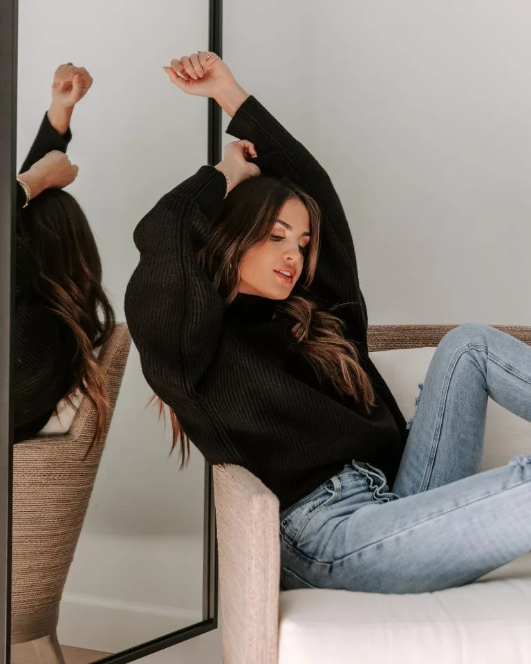 Every wardrobe needs the Khloe Knit Mock Neck Pullover Sweater in black that features a turtle neckline.