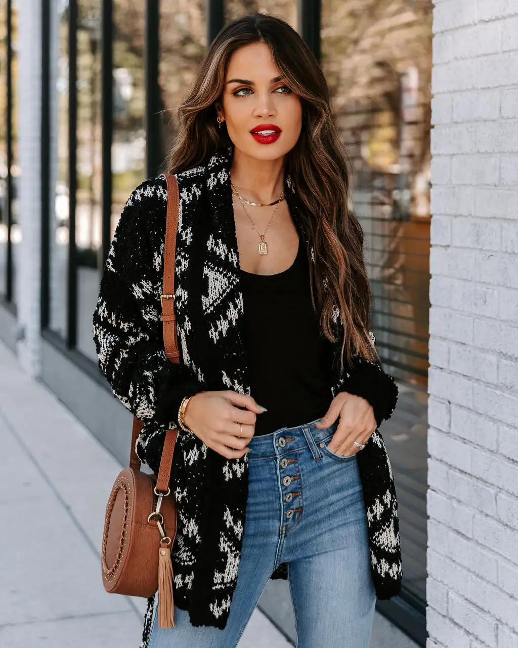 Our Koma Belted Knit Cardigan is the perfect layer of warmth! This black and ivory patterned cardigan features an adjustable waist belt. Designed with long sleeves and a soft knit fabrication. Styled with the Minimal Herringbone Necklace, Initial Card Necklace, Simple Bangle Bracelet, Round Town Crossbody Bag, Physique Racerback Tank, Only The Best High Rise Button Front Skinny, and Formal Faux Suede Heel.