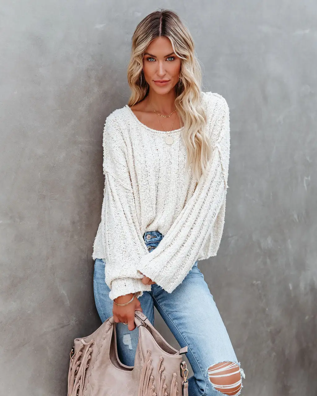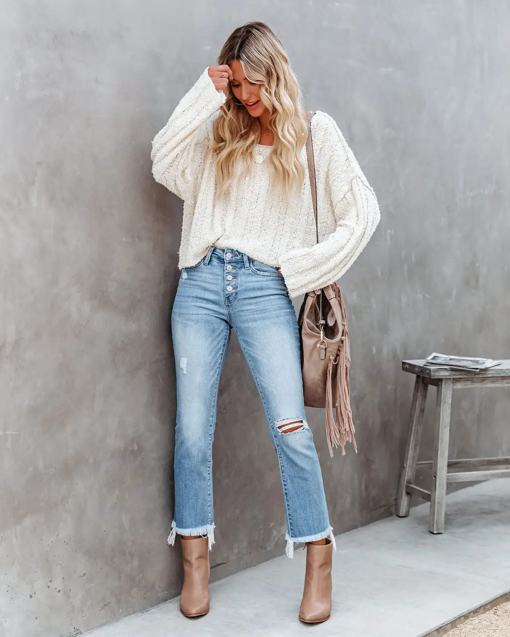 You’ll be wearing our Kye Cotton Blend Knit Sweater on repeat this season! Speckled ivory spots make up this knit sweater. Designed with a scooped neckline and a subtly cropped fit. Styled with the Perfect Hoop Earrings, Chloe Mini Necklace, Mosaic Coin Necklace, Simple Bangle Bracelet, Redding Fringe Handbag, Casabella High Rise Kick Flare Denim, and Tribeca Faux Leather Heeled Bootie.