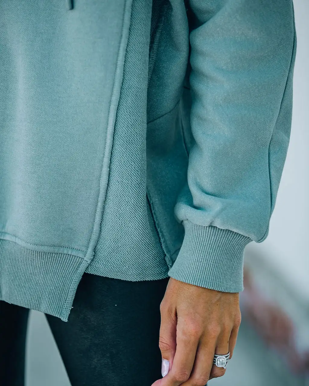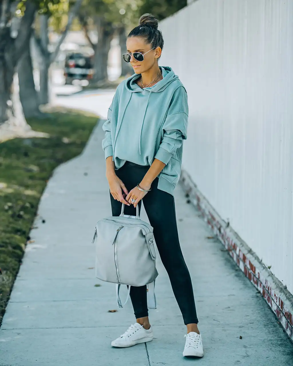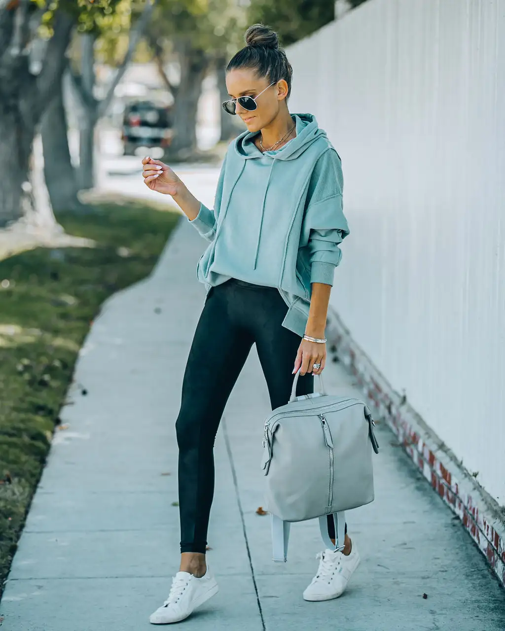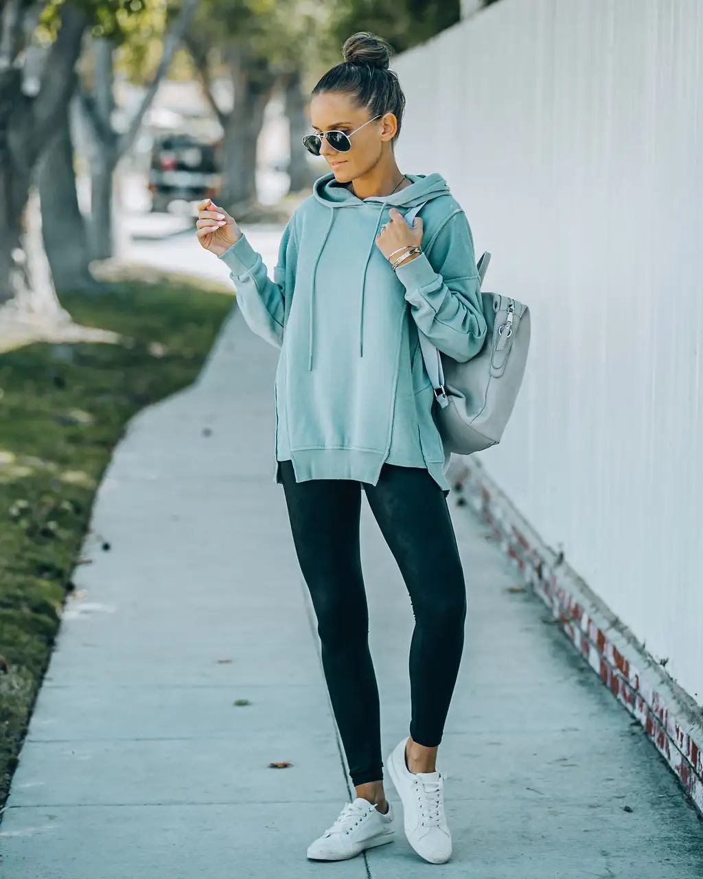 //VICI Exclusive// Relax all sunday long in our Kyrie Cotton Blend Hoodie! This dusty blue hoodie features a drawstring neckline. Designed with ribbed edges and a soft fabrication. Styled with the Chloe Mini Necklace, Simple Bangle Bracelet, Kenzie Backpack, Faux Leather Legging, and Common Thread Sneaker.