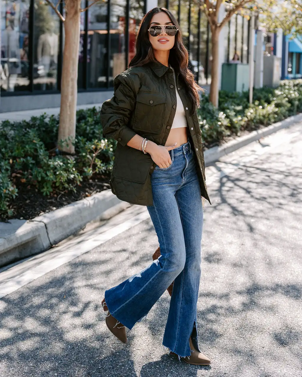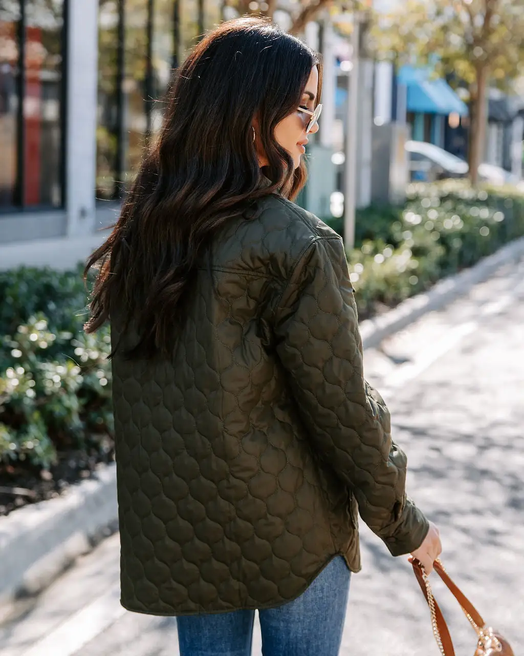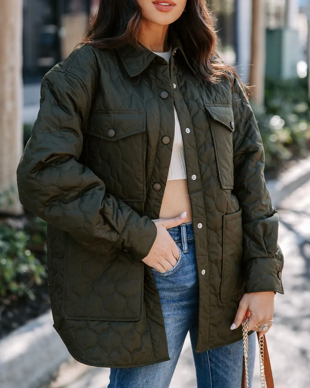 Add a layer of warmth in the Landry Quilted Pocketed Jacket in olive that features front button closures.