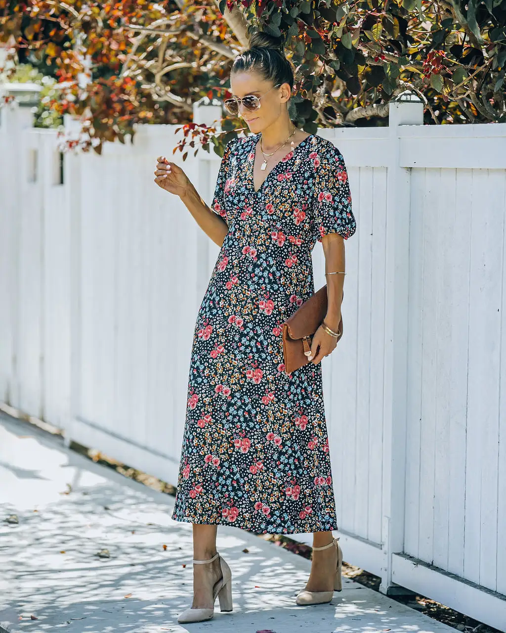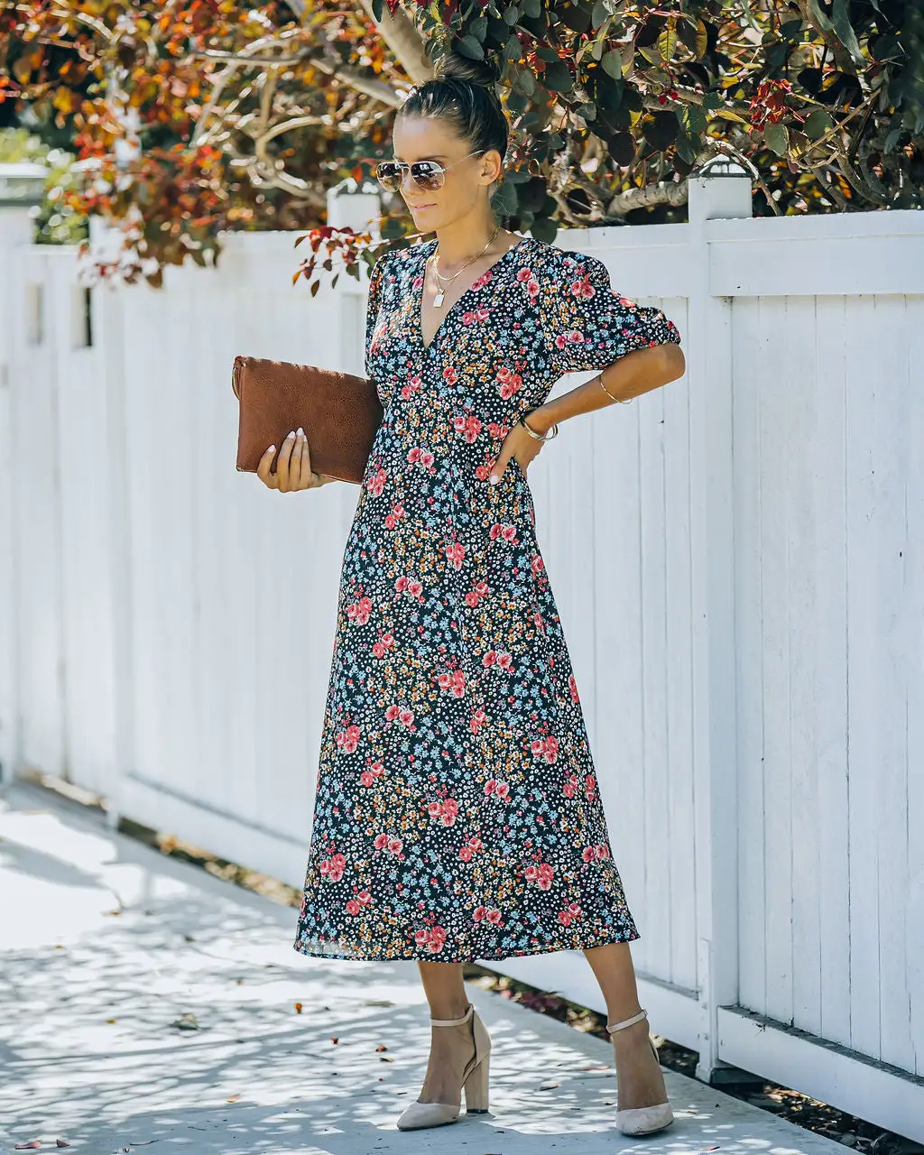 Dress up your saturday in our Larsen Floral Midi Dress! Black, sky blue, mauve, pink, ivory, olive, hunter green, orange, and yellow florals detail this midi. Designed with a v-neckline and billowed sleeves. Styled with the Minimal Herringbone Necklace, Initial Card Necklace, Simple Bangle Bracelet, Stella Crossbody Envelope Zip Clutch, and Ritz Faux Suede Pointed Heel.
