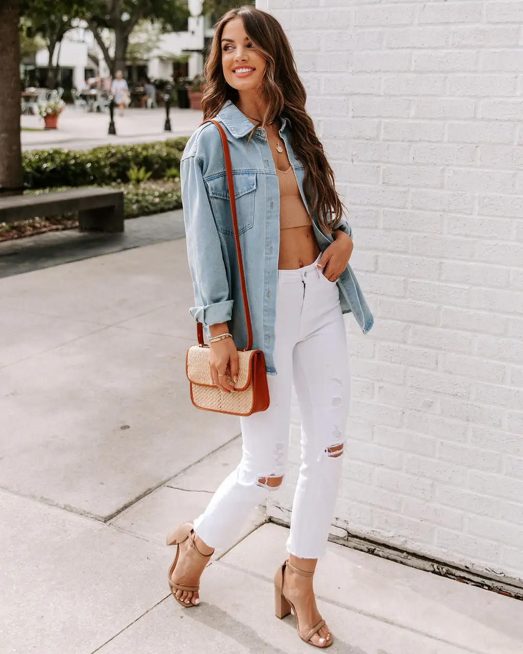 Styled with: Mercury Hoops, Chloe Mini Necklace, Compass Coin Necklace, Sophie Bag, Exhale Top, Henderson Denim, and Anna Sandal.