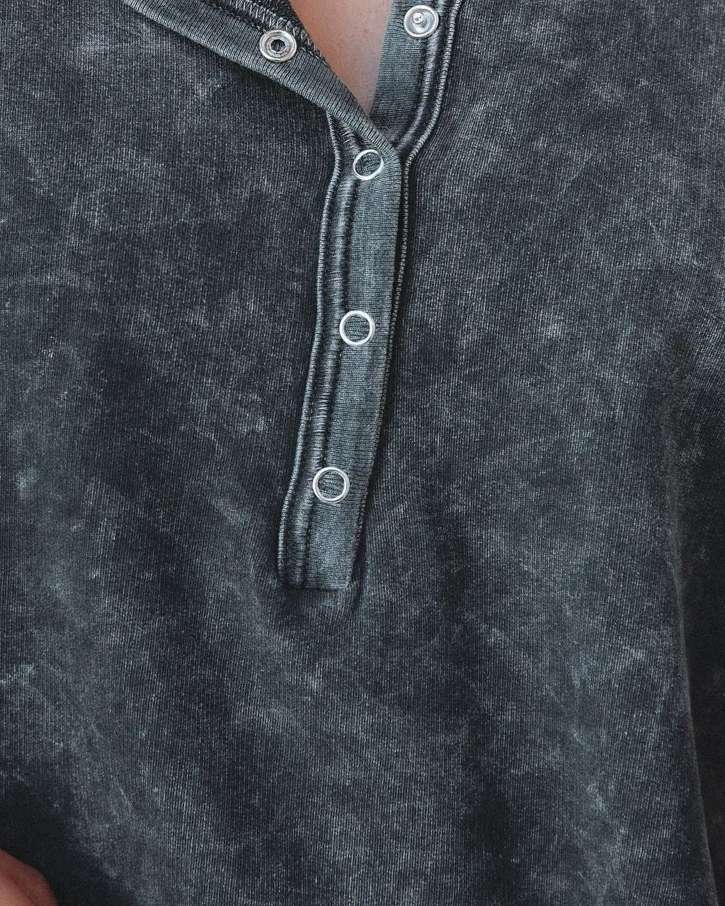 Stay cozy at home in our Layth Cotton Mineral Wash Crop Henley Top! This charcoal colored crop top features front henley snap button closures. Designed with side slits and long sleeves. Styled with the Chloe Mini Necklace, Initial Card Necklace, and Kason Distressed High Rise Denim.