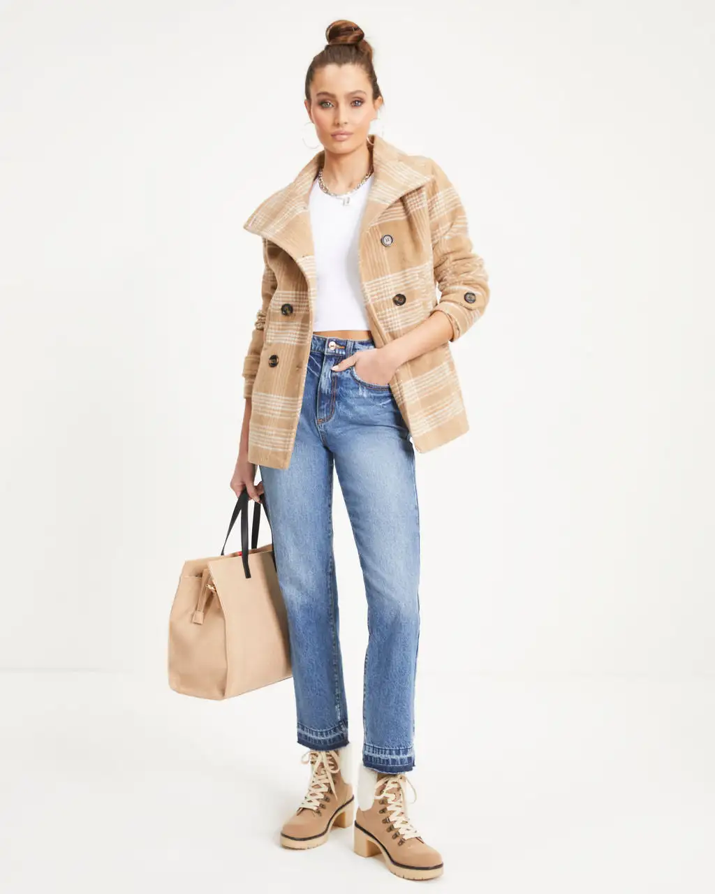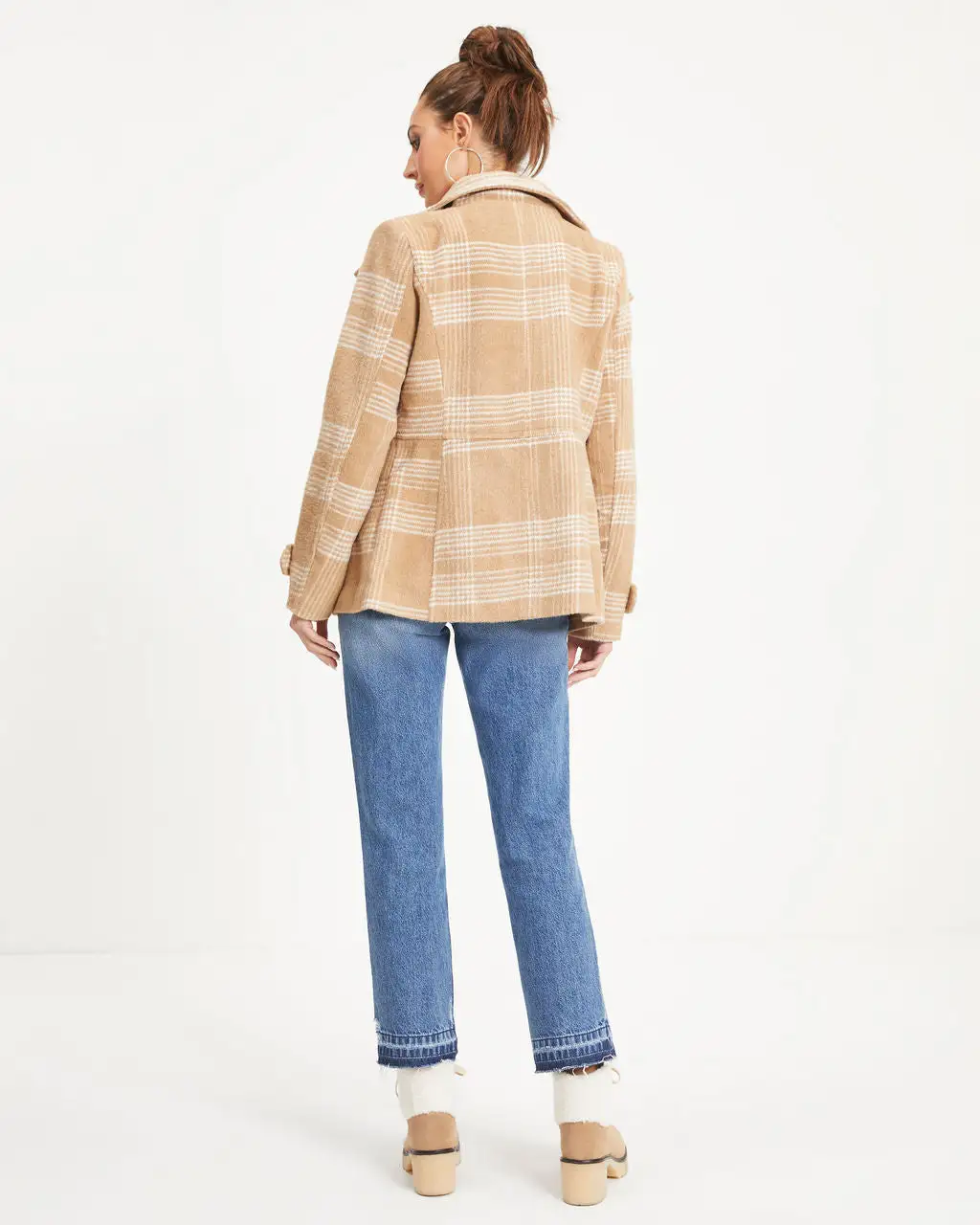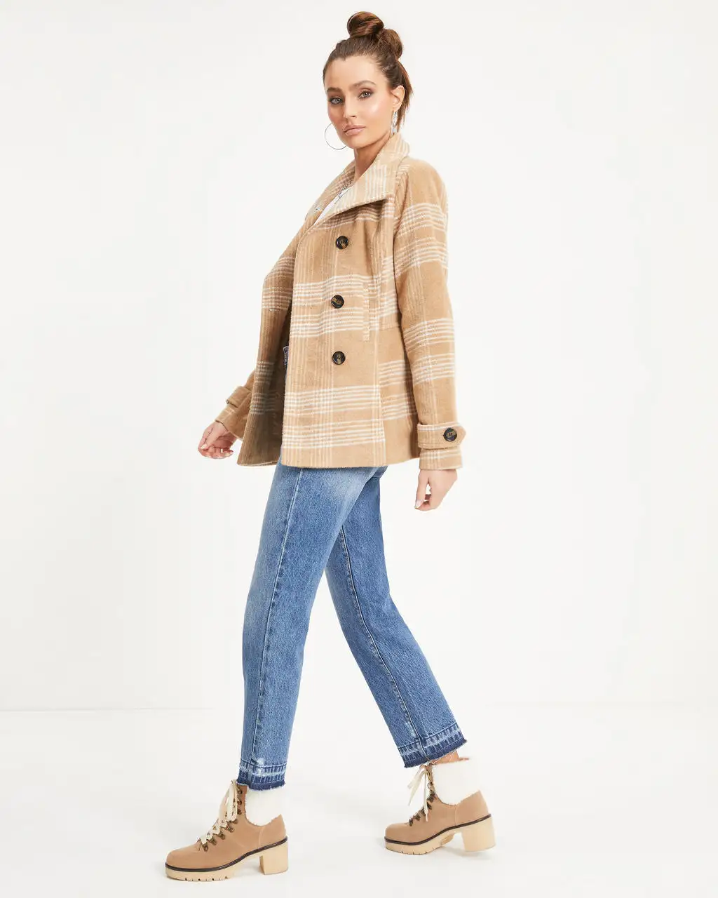 Every fashionista needs the Let’s Talk New Pocketed Jacket in camel that features front button closures.