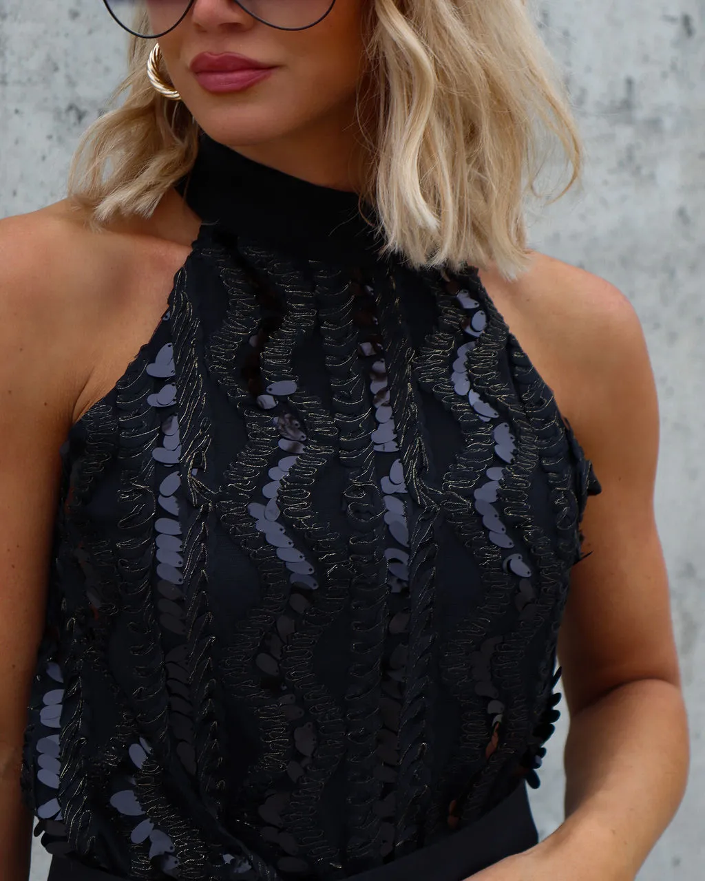 Get ready for the holidays in the Light Of Darkness Textured Sequins Sleeveless Top in black that features a high neckline.