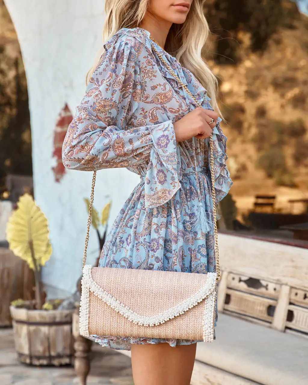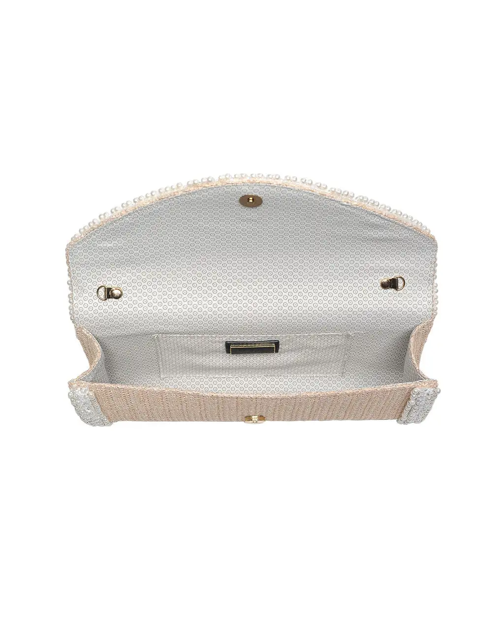 Chic for spring, the Lillia Woven Beaded Crossbody Clutch features white beads and faux pearls.