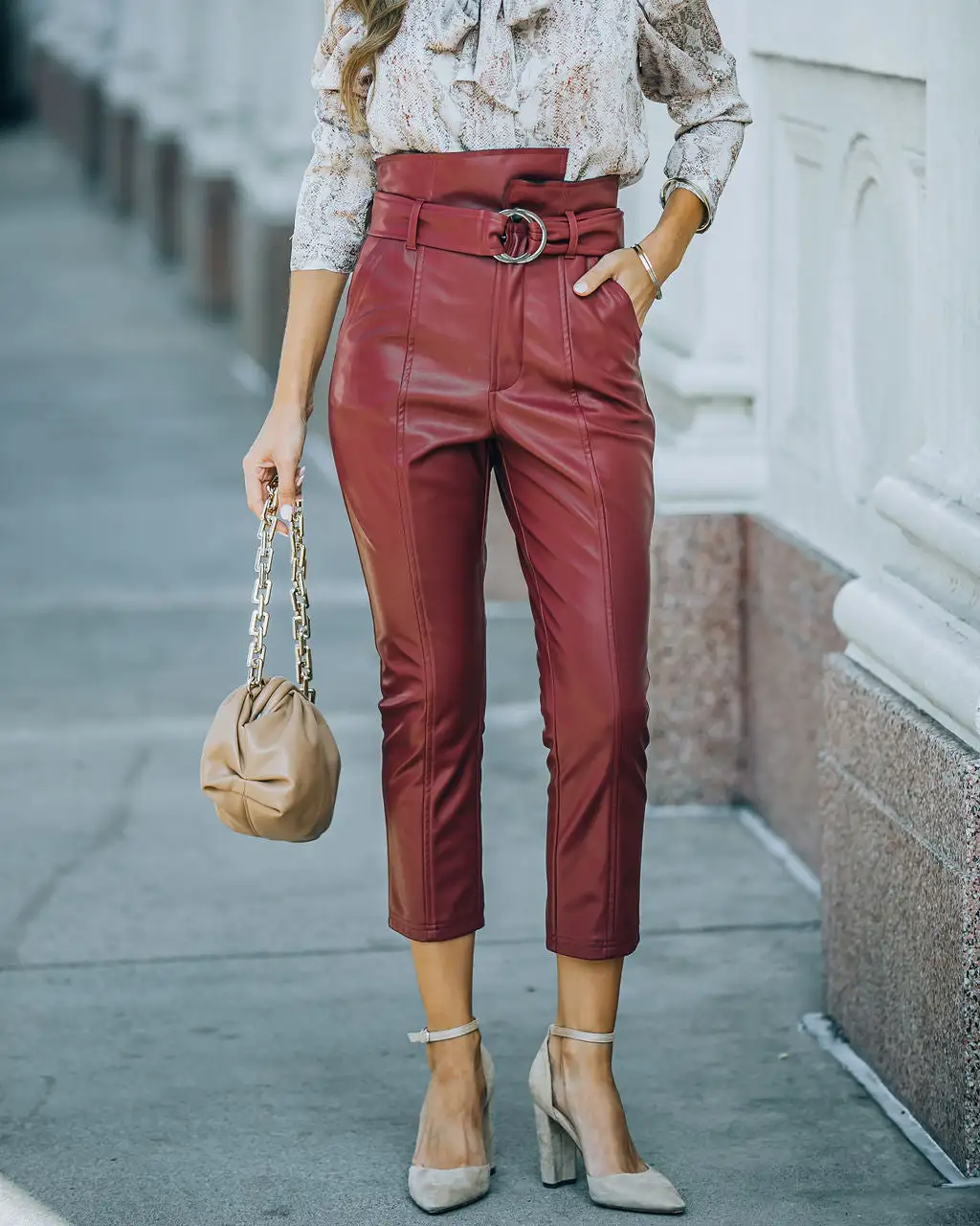 //VICI Exclusive// Major boss babe energy in our Livi Pocketed High Rise Faux Leather Belted Pants! These wine colored pants feature an adjustable waist belt. Designed with a high rise and a straight leg. Styled with the Simple Bangle Bracelet, Chic Crossbody Chain Pouch Bag, Kitana Snake Print Button Down Blouse, and Ritz Faux Suede Pointed Heel.