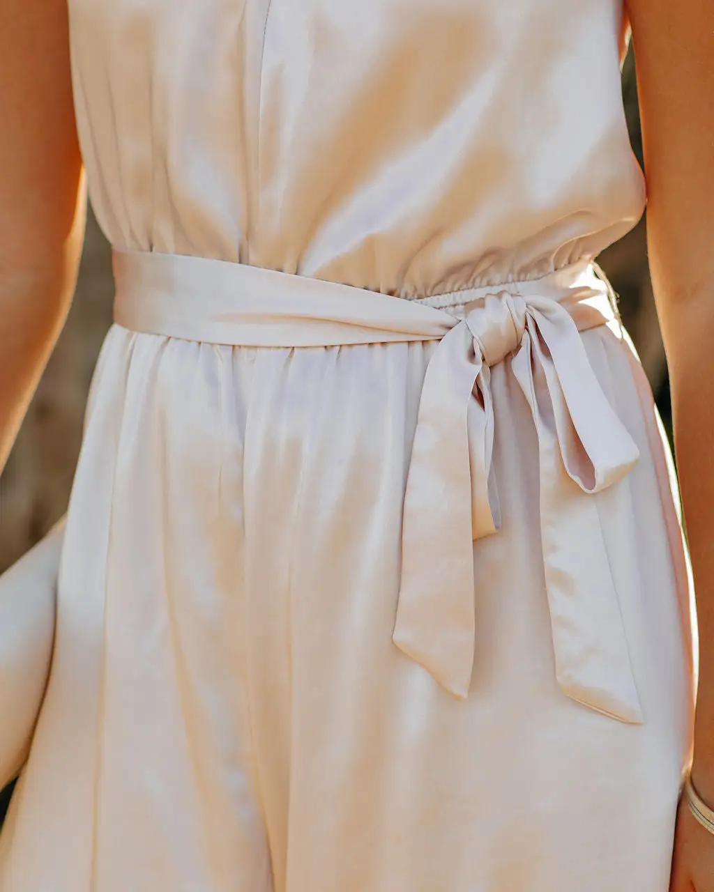 Our Livorna Satin Halter Jumpsuit is perfect for your bridal shower! This champagne hued jumpsuit features an adjustable waist tie closure. Designed with a high neckline and a chest keyhole. Styled with the Tania Triangle Earrings, Lauren Chain Cuff, Simple Bangle Bracelet, Stella Crossbody Envelope Zip Clutch, and Whimsy Heel.