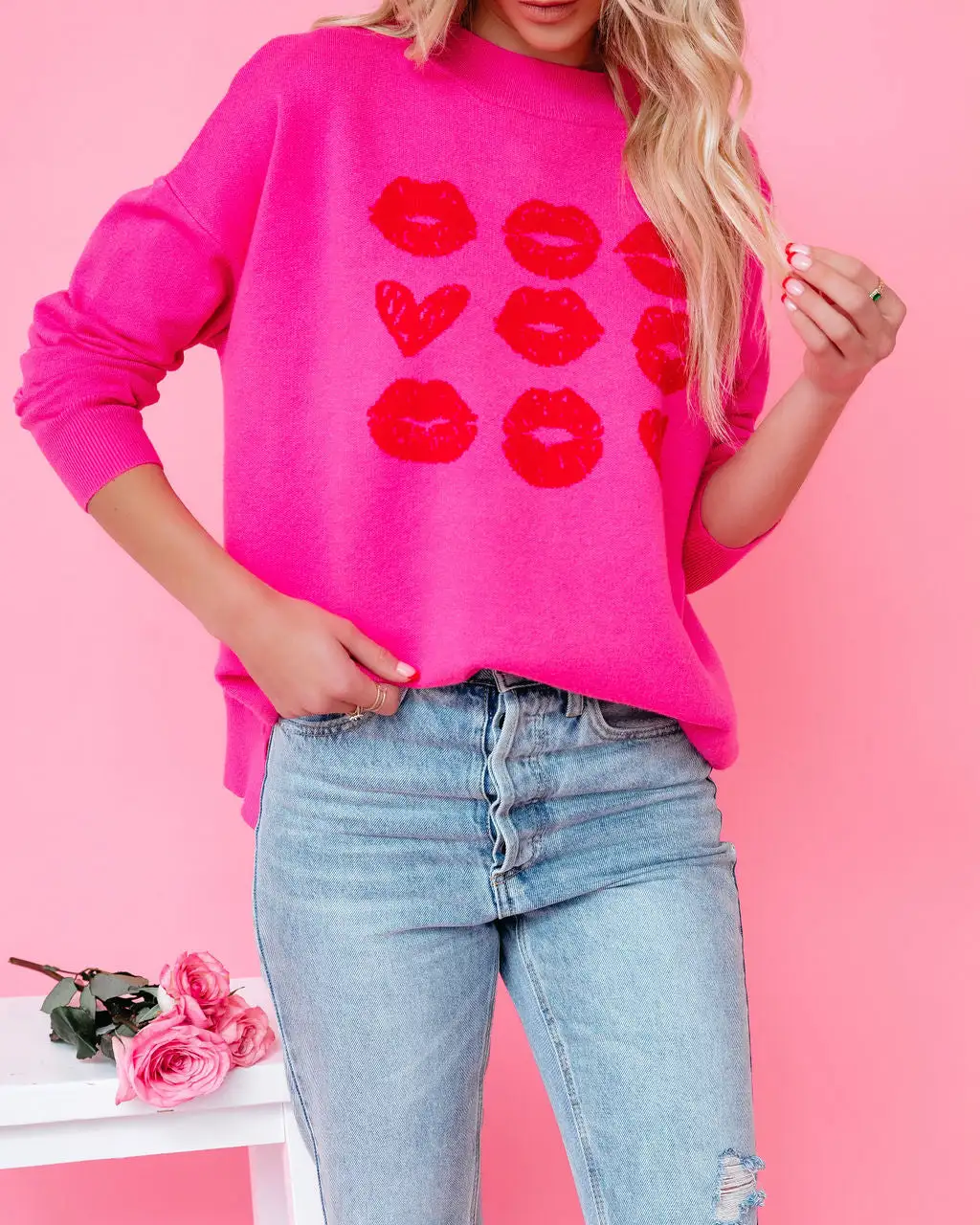 Get ready for V-Day in our Love At First Sight Knit Sweater! This pink sweater features a red front graphic. Designed with a side slit and ribbed edges. Finished with a high neckline. Styled with the Showstopper Statement Earrings and Kason Distressed High Rise Denim.
