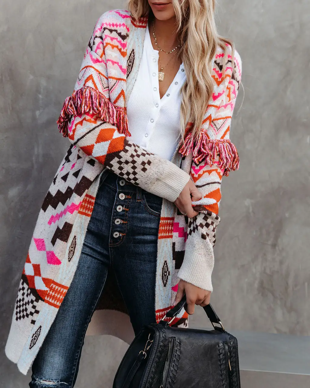 Our Loving Life Fringe Knit Cardigan is ready for snowy mountain gazing! This beige, pink, orange, light blue, and brown multi knit cardi features a fringe trimming. Designed with an open front. Styled with the Chloe Mini Necklace, Initial Card Necklace, Highland Bag, Elise Ribbed Henley Bodysuit, Tilley Frayed Ankle High Waisted Skinny, and Jocelyn Heeled Bootie.