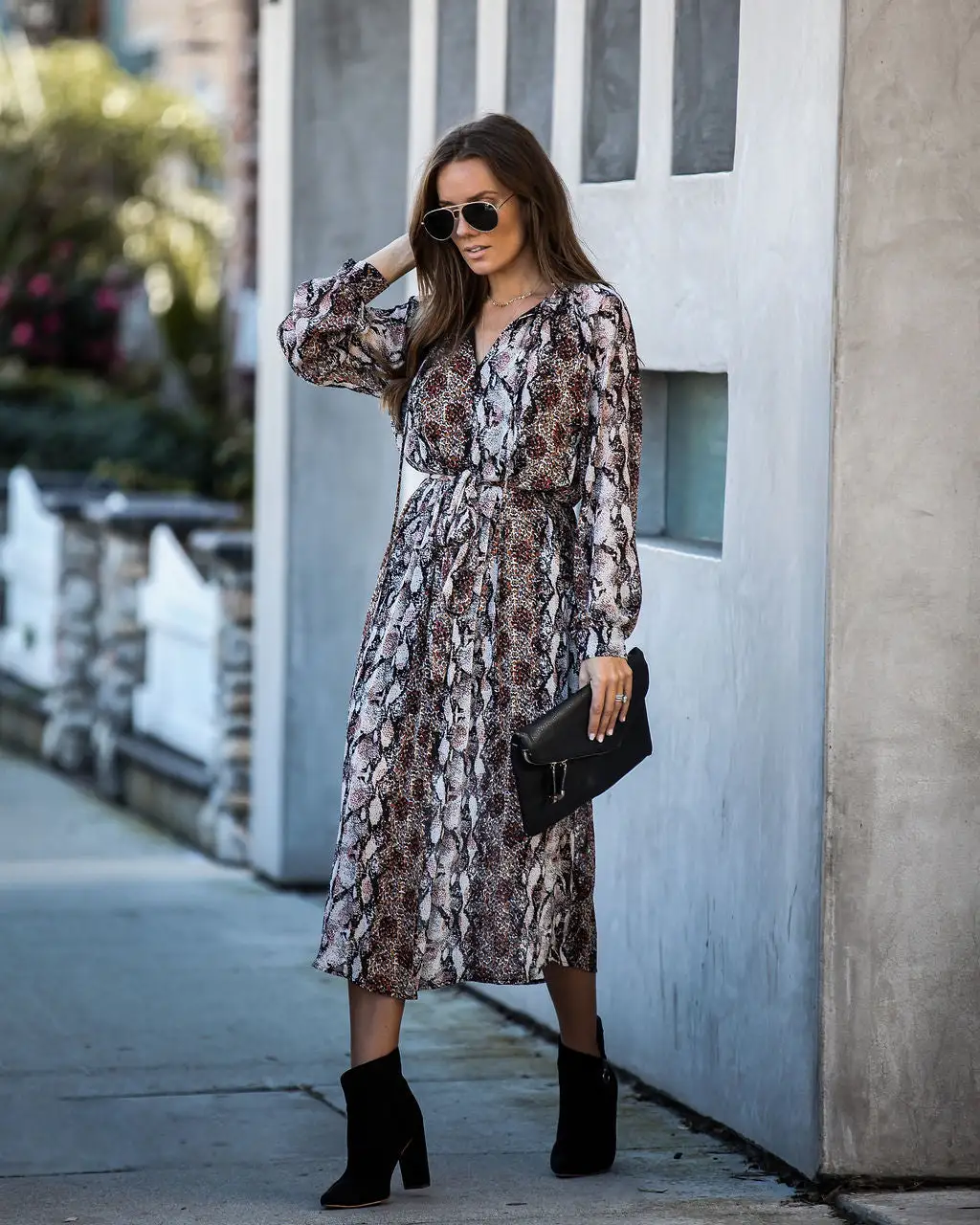 Our Lure Of The Unknown Pleated Maxi Dress is a chic + modern style for the girl on the go! Crafted in a softly pleated fabrication with a mixed animal print in black, white, red and rust. Designed with a split neckline, cuffed long sleeves, and a waist tie to accentuate the fit. A flawless work to weekend look with an effortless appeal! Finished with a lined body and necktie closures. Styled with the Chloe Mini Necklace, The Buddha Wheel Necklace, Outgoing Faux Suede Heeled Bootie and the Stella Crossbody Envelope Zip Clutch.