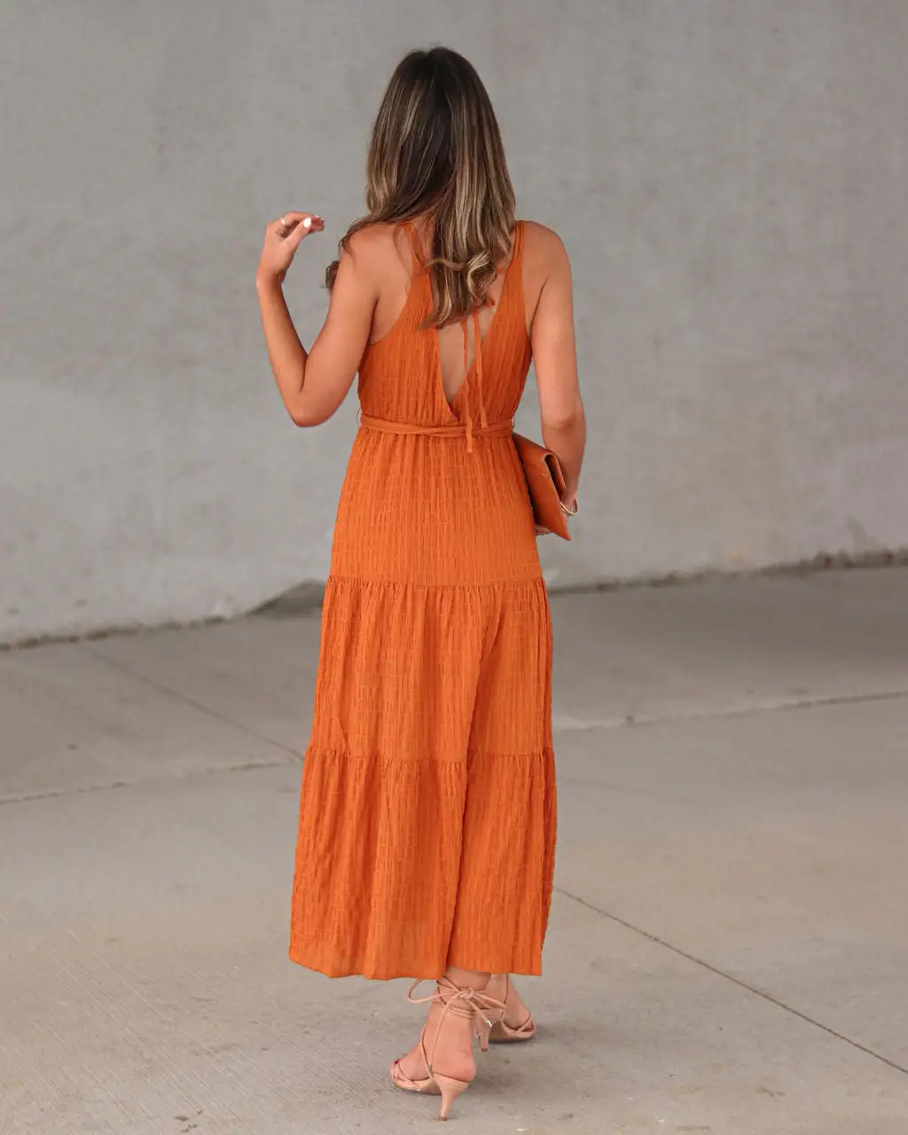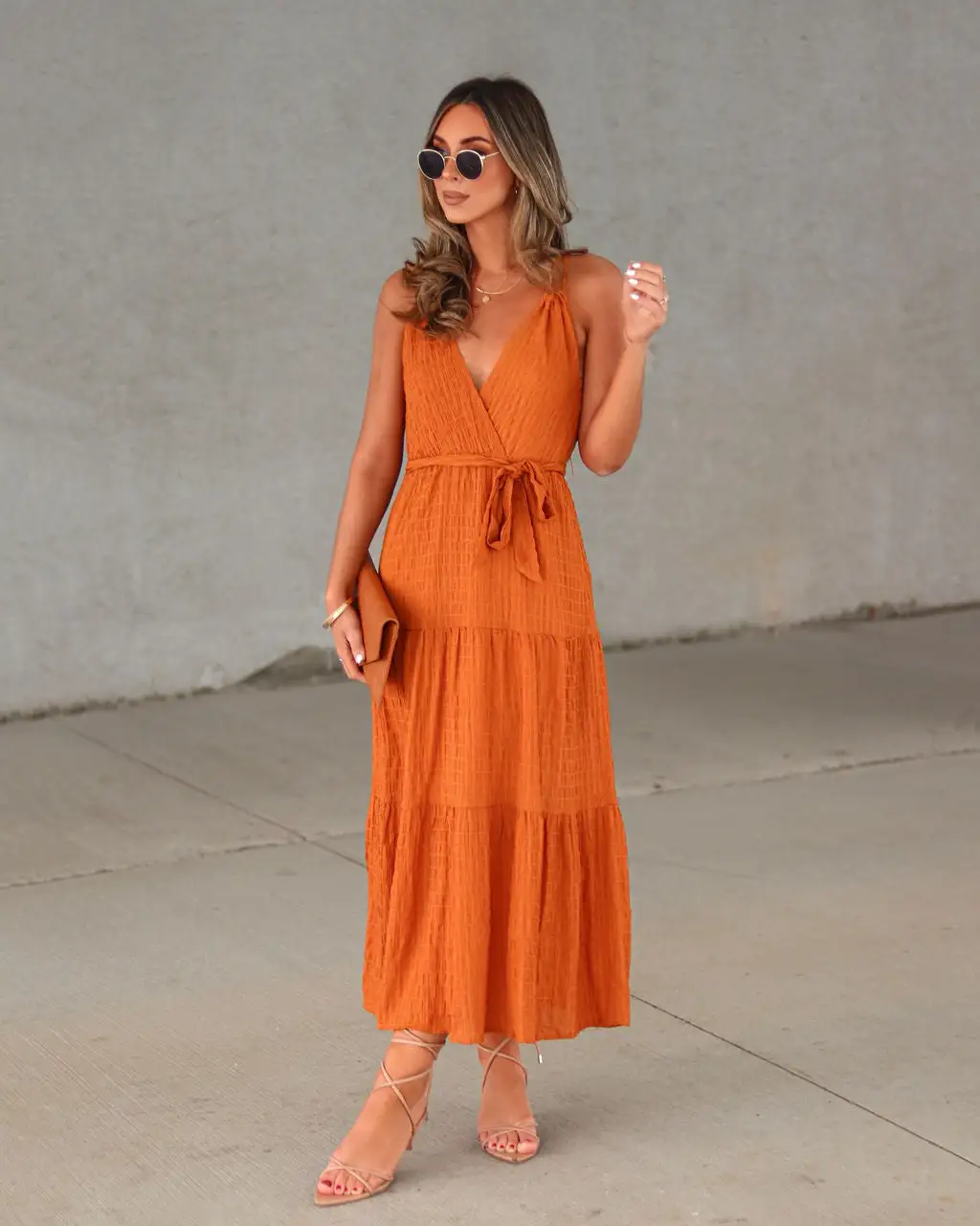 Look adorable at the resort in the Follow Your Path Textured Waist Tie Midi Dress in camel that features a flowy fit.