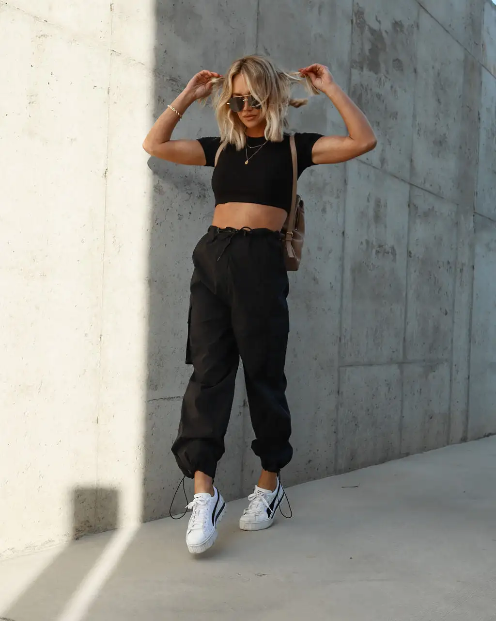 Cool girls will love the Arnie High Rise Cargo Pants in black that feature a relaxed fit.