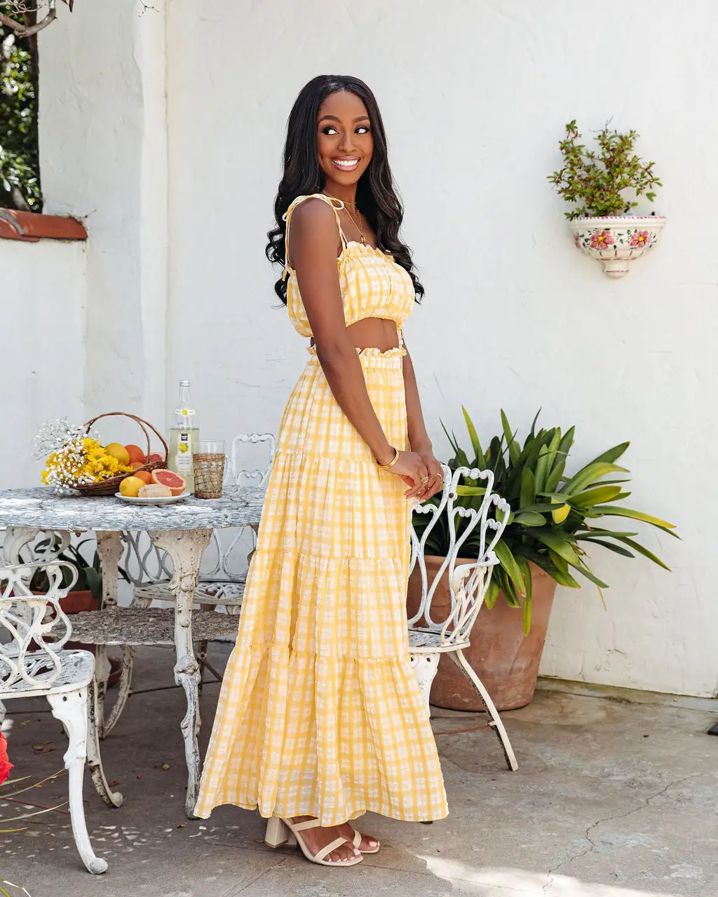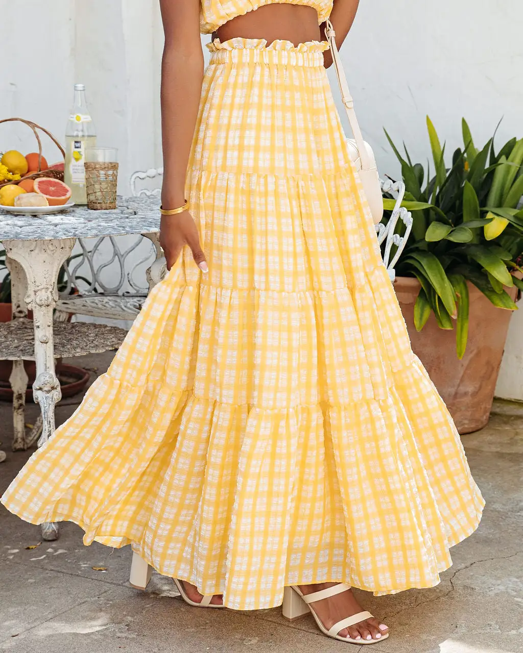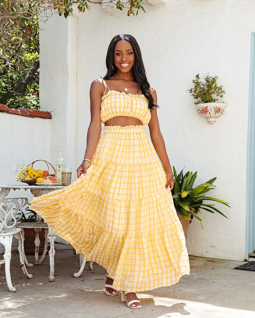 Go on a summer picnic in the Buttercup Gingham Maxi Skirt Top in yellow and white that features a textured fabrication.