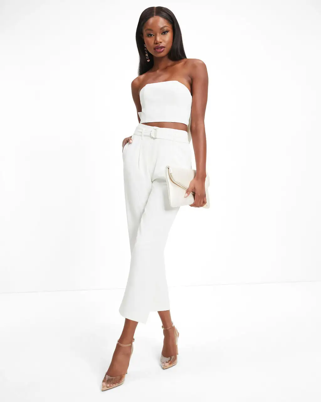 Girly meets festive in the Put A Bow On It Strapless Crop Top in off white that features a decretive bow.