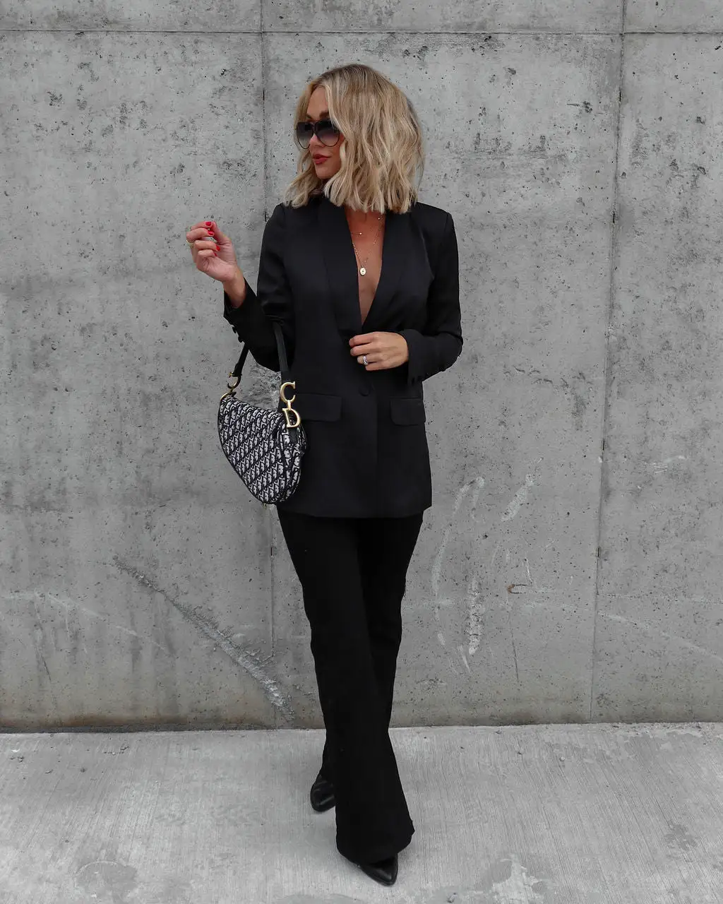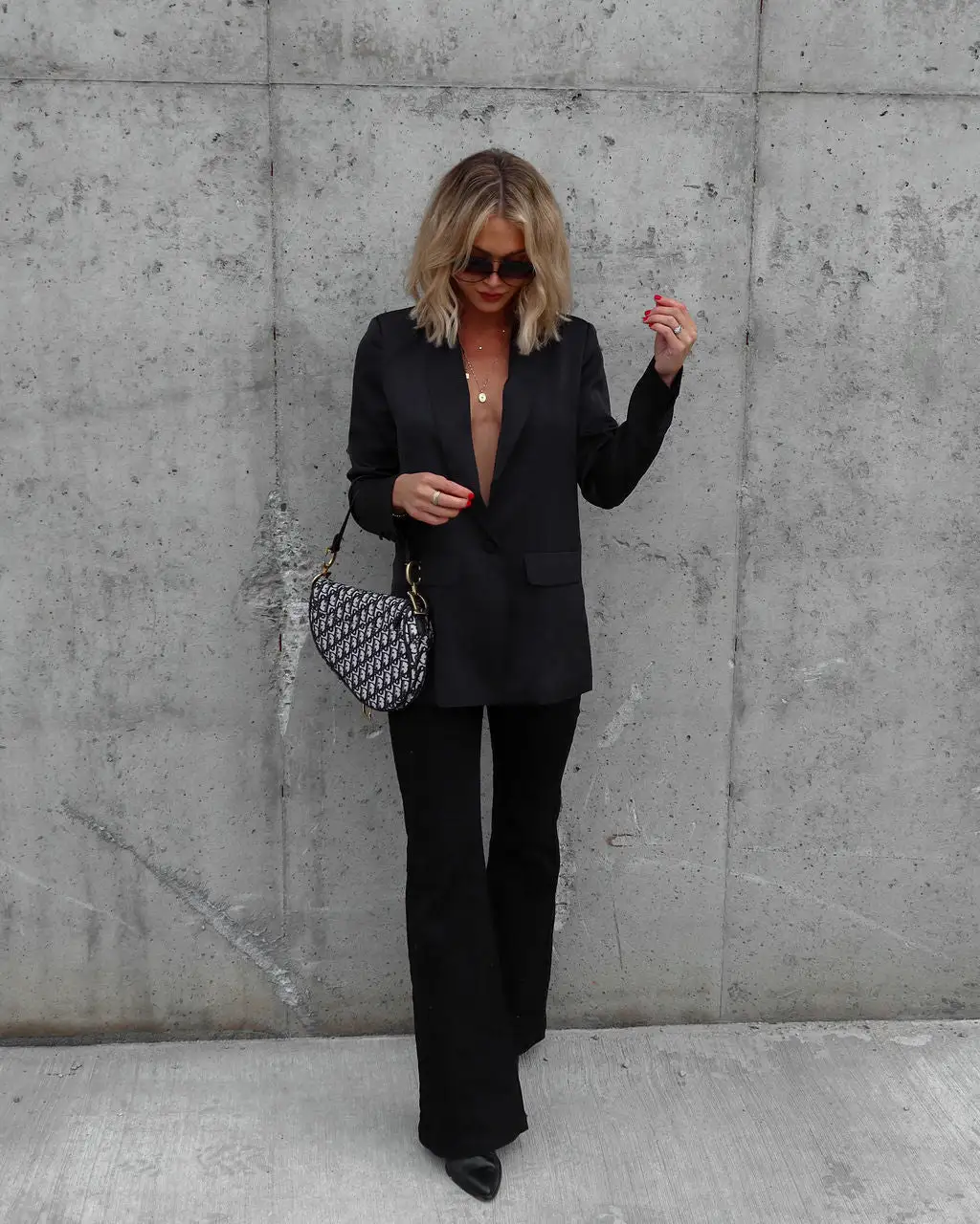 Chic babes will love the Shelly Satin Pocketed Blazer in black that features padded shoulders.