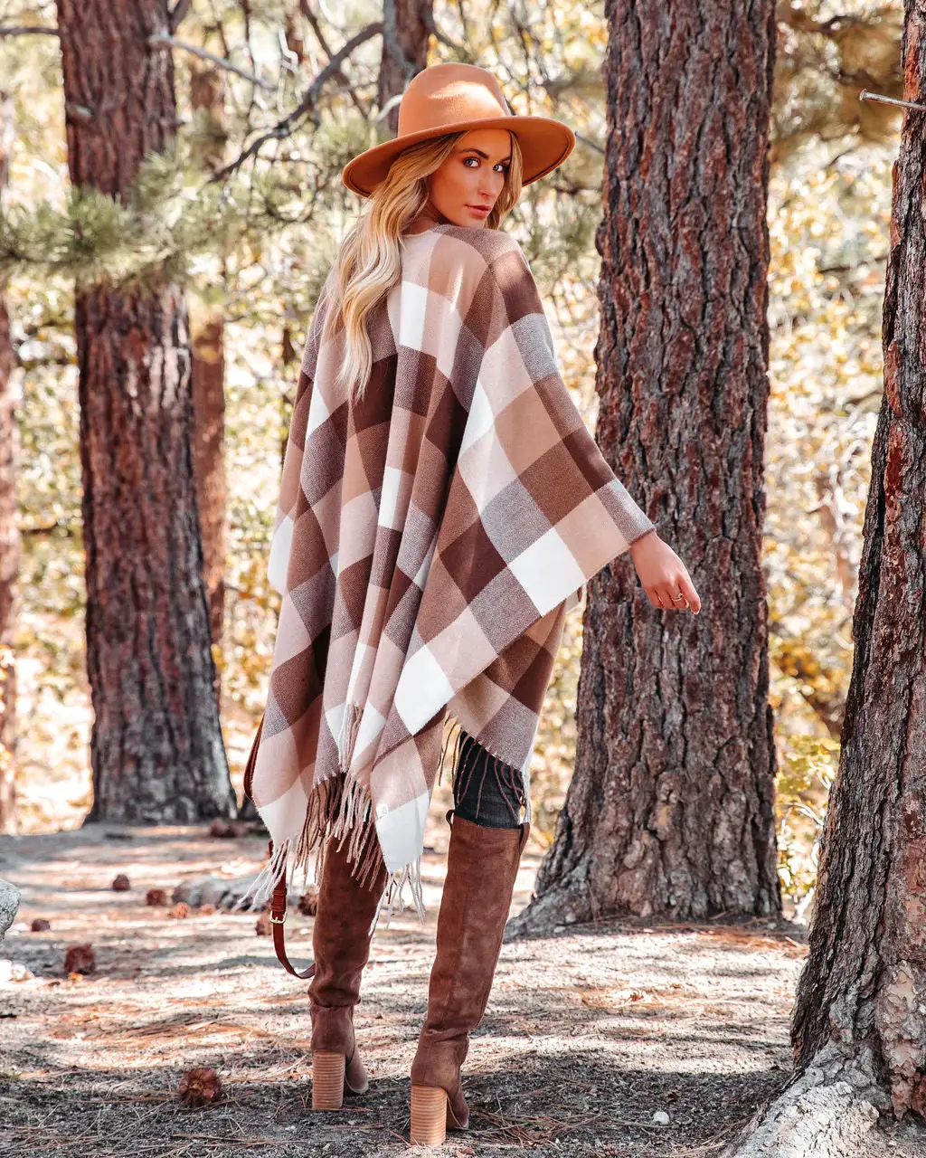 //Best Seller// New Color// Add the perfect layer of warmth over any outfit in our Madison Checkered Fringe Poncho! Brown, khaki, and white checkers make up this soft knit piece. Designed with a fringe hemline and an open front. Styled with the El Dorado Hat, Tahiti Hoops, Crystal Droplet Choker, The Buddha Wheel Necklace, Highland Bag, Physique Racerback Tank, Gemma High Rise Distressed Skinny, and Saint Slouch Boot.