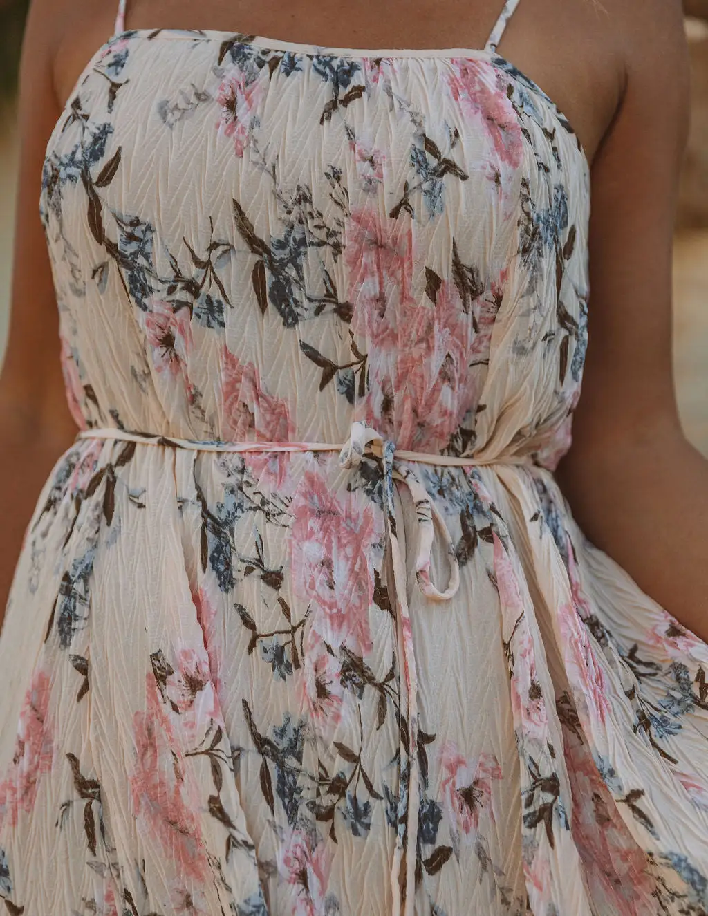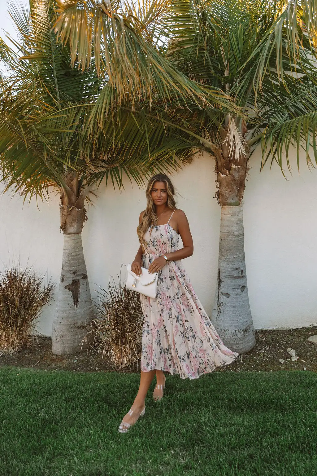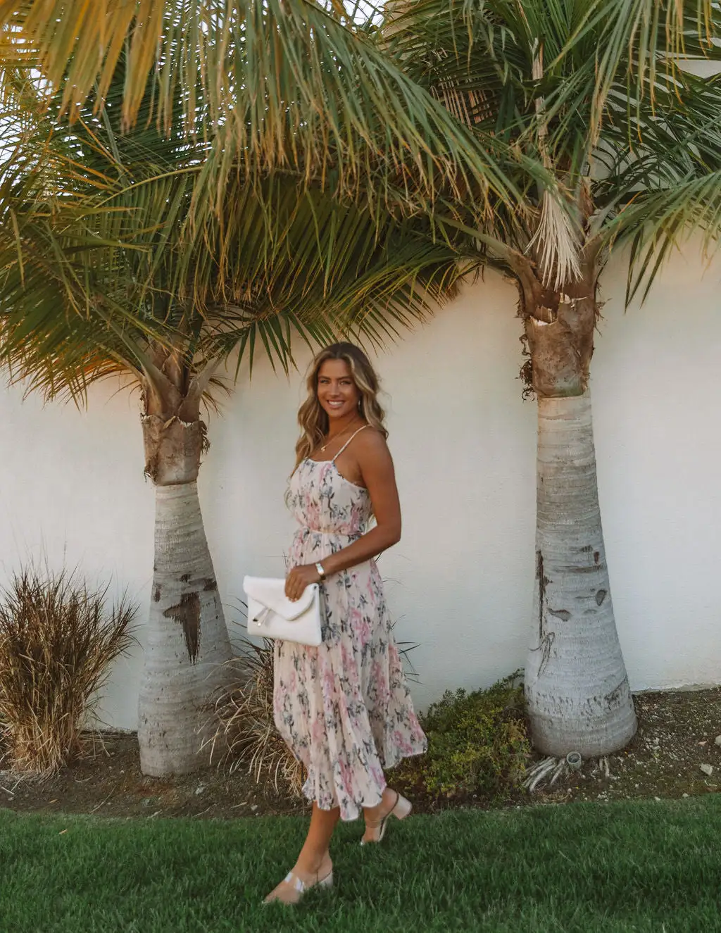 //Best Seller//New Color// Our Madly In Love Floral Midi Dress features summertime blooms in pink, dusty blue, navy, mocha, blush, and ivory on a crinkled almond base. Adjustable straps support a square neckline, smocked back and a relaxed fit. A thin waist tie defines the silhouette while a flowy midi skirt finishes the look. Fully lined. Styled with the Perfect Hoop Earrings, Compass Coin Necklace, Simple Bangle Bracelet, Stella Crossbody Envelope Zip Clutch, and Heather Clear Strap Block Heeled Sandal.