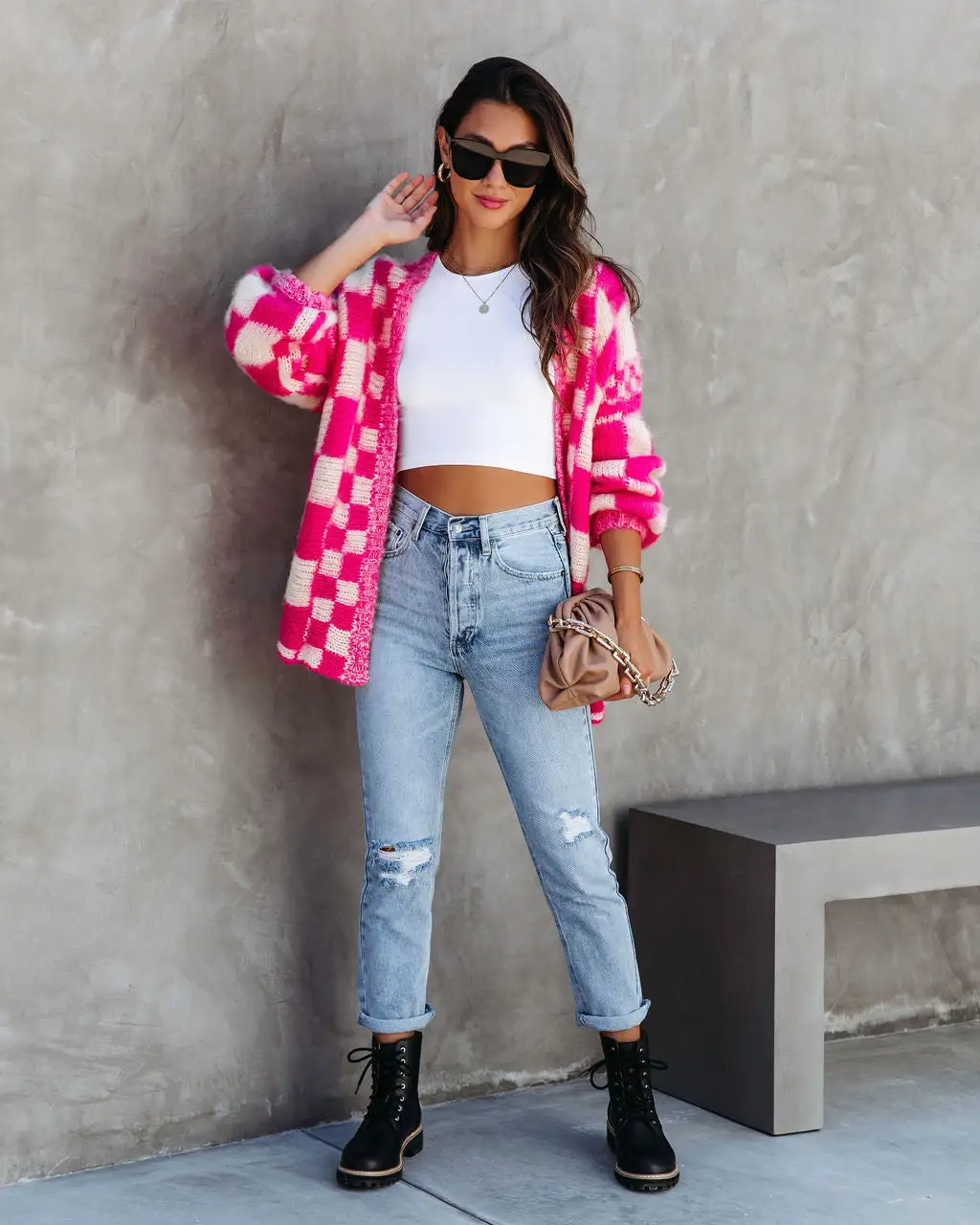 Add playful vibes to your closet in the Make A Move Checkered Knit Cardigan in fuchsia multi that features an open front.