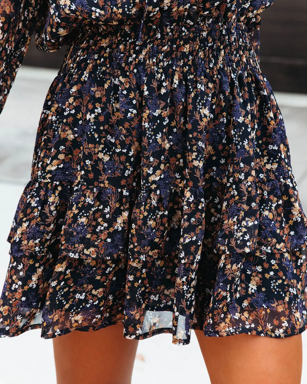 We’re loving the vintage vibes of our Make It Count Floral Smocked Ruffle Mini Dress in indigo meadow that features a v-neckline.