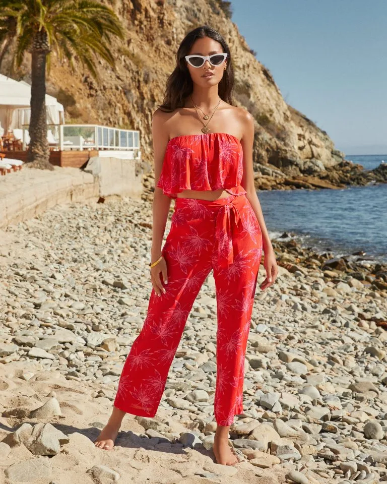 Nothing screams vacay more than a palm printed set! Our Maldives Floral Pocketed Tie Pants are is pink, magenta, and red. Designed with a high rise and an adjustable waist tie. Wear these pants with the matching top and sandals. Styled with the Iva Cat Eye Sunglasses, Gigi Double Coin Necklace, Glory Bangle Bracelet, Stella Crossbody Envelope Zip Clutch, and Maldives Floral Strapless Crop Top.