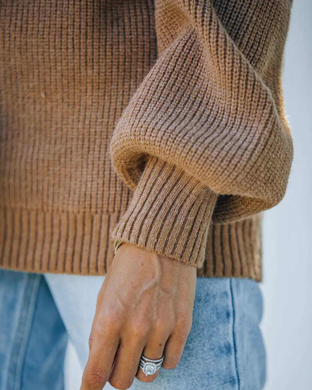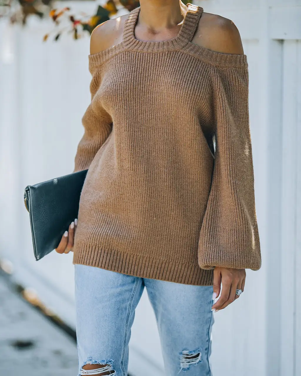 Our Malia Cold Shoulder Knit Sweater adds detail to your ‘fit! This camel cold shoulder knit sweater will keep you warm all season long with it’s long sleeves. Tuck this top into faux leather leggings! Styled with the Simple Bangle Bracelet, Stella Crossbody Envelope Zip Clutch, Kason Distressed High Rise Denim, and Jocelyn Heeled Bootie.