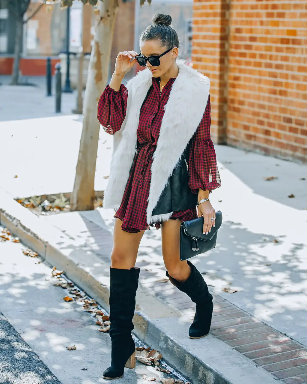 //VICI Exclusive// Go for a fierce look in our Mammoth Pocketed Faux Fur Lined Vest! This black vest features a cream faux fur lining. Designed with side zipper pockets and an open front. Styled with the Carson Black Frame Dark Smoke Polarized Sunglasses, Chloe Mini Necklace, Compass Coin Necklace, Stella Crossbody Envelope Zip Clutch, Manchester Adjustable Balloon Sleeve Dress, and Saint Slouch Boot.