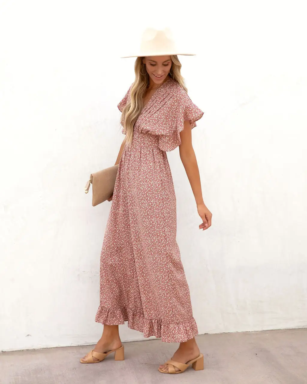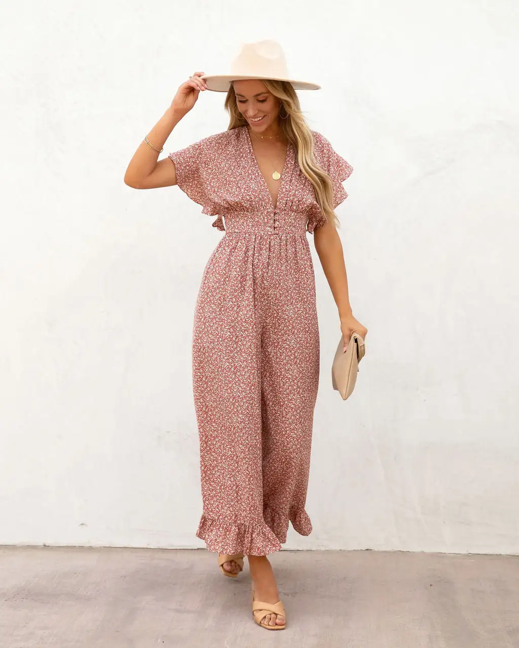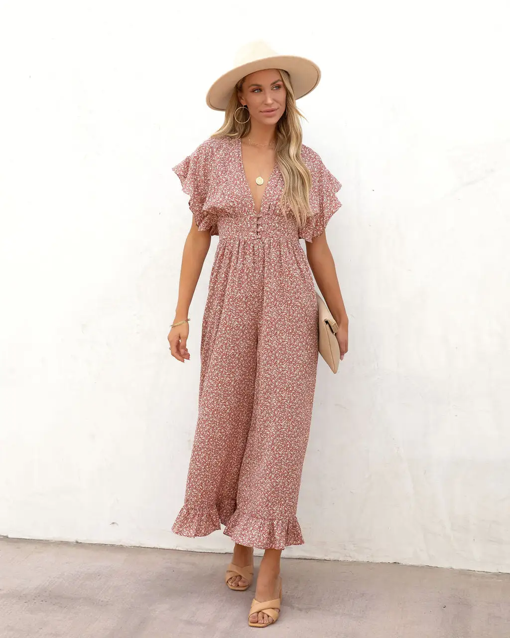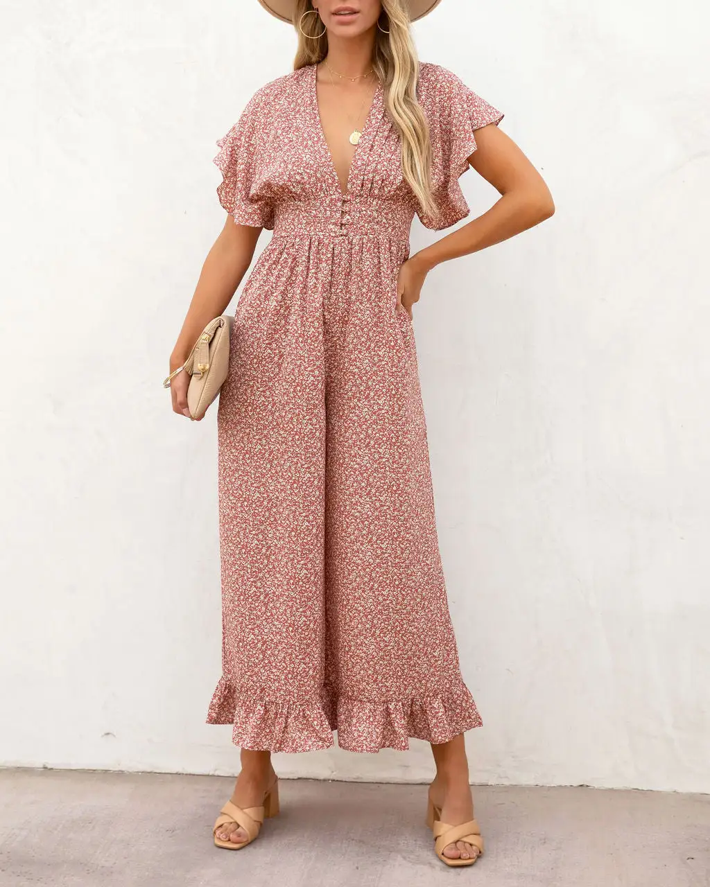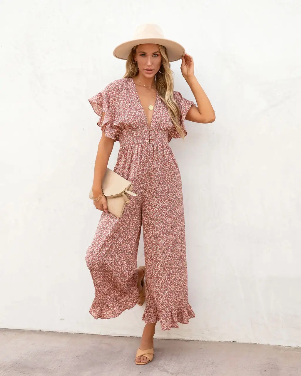 Beachy and pretty, the Mariah printed Flutter Sleeve Jumpsuit in dusty rose features a plunging neckline.