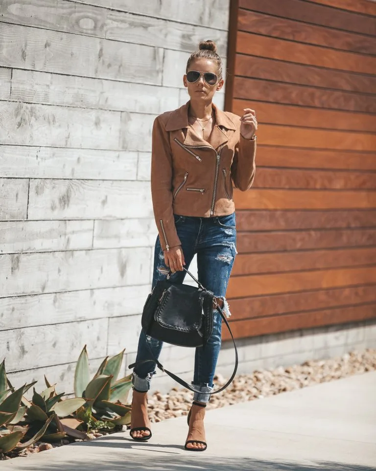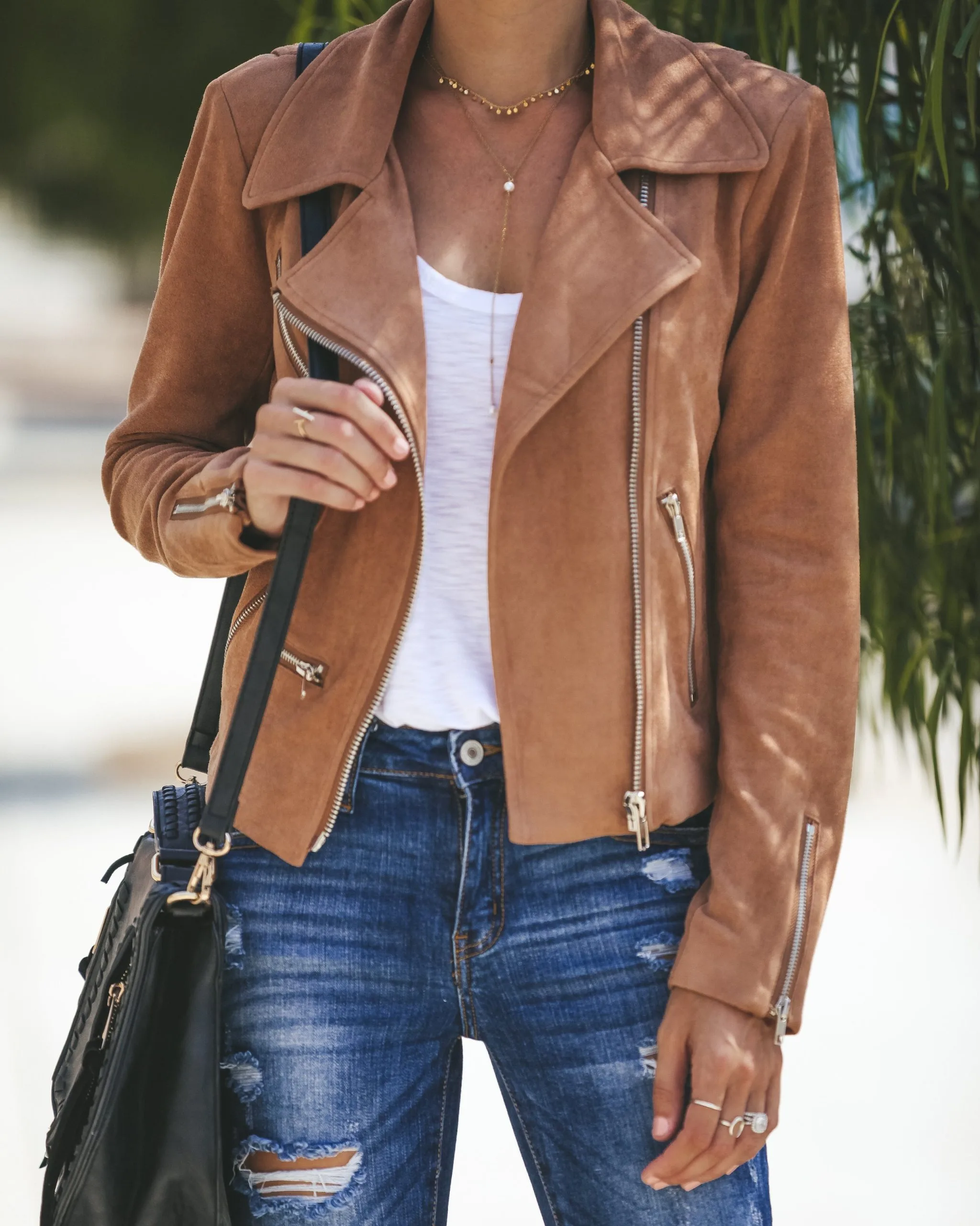 //VICI Staple// Our favorite jacket ever and best-selling VICI staple is back! The Market Jacket is ultra-chic in this luxe, faux suede fabrication that has zippered front pockets and zipper sleeve accents for an adjustable fit. A buttery soft texture makes this jacket stretchy, lightweight and comfortable for all-day wear. This washes and wears beautifully! Throw our Market Jacket over all of your graphics and blouses for an elevated look! Styled with our Physique Racerback Tank, Universal Distressed Frayed Denim, After Hours Heel and the Highland Bag.
