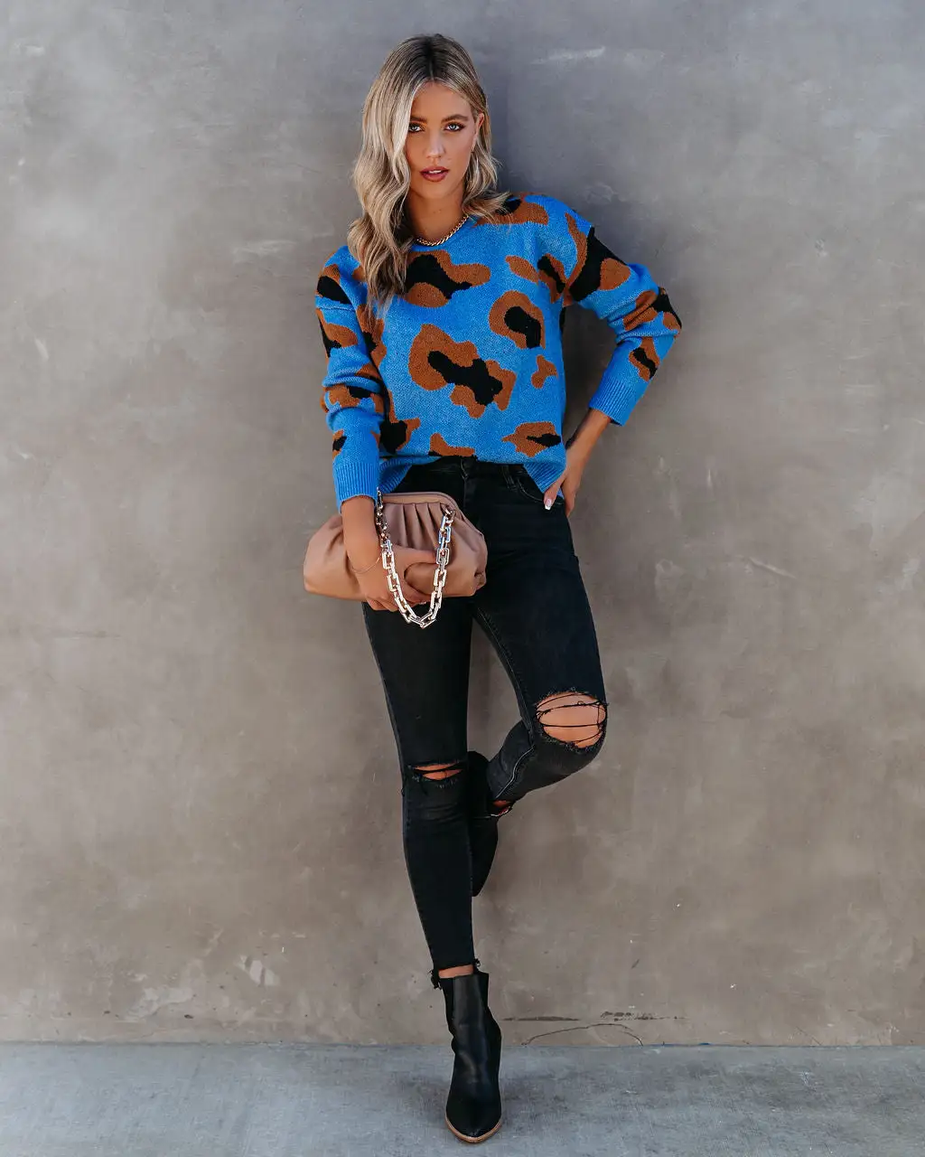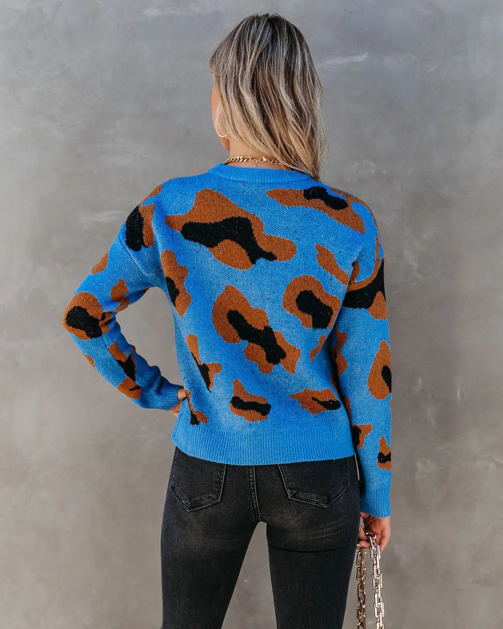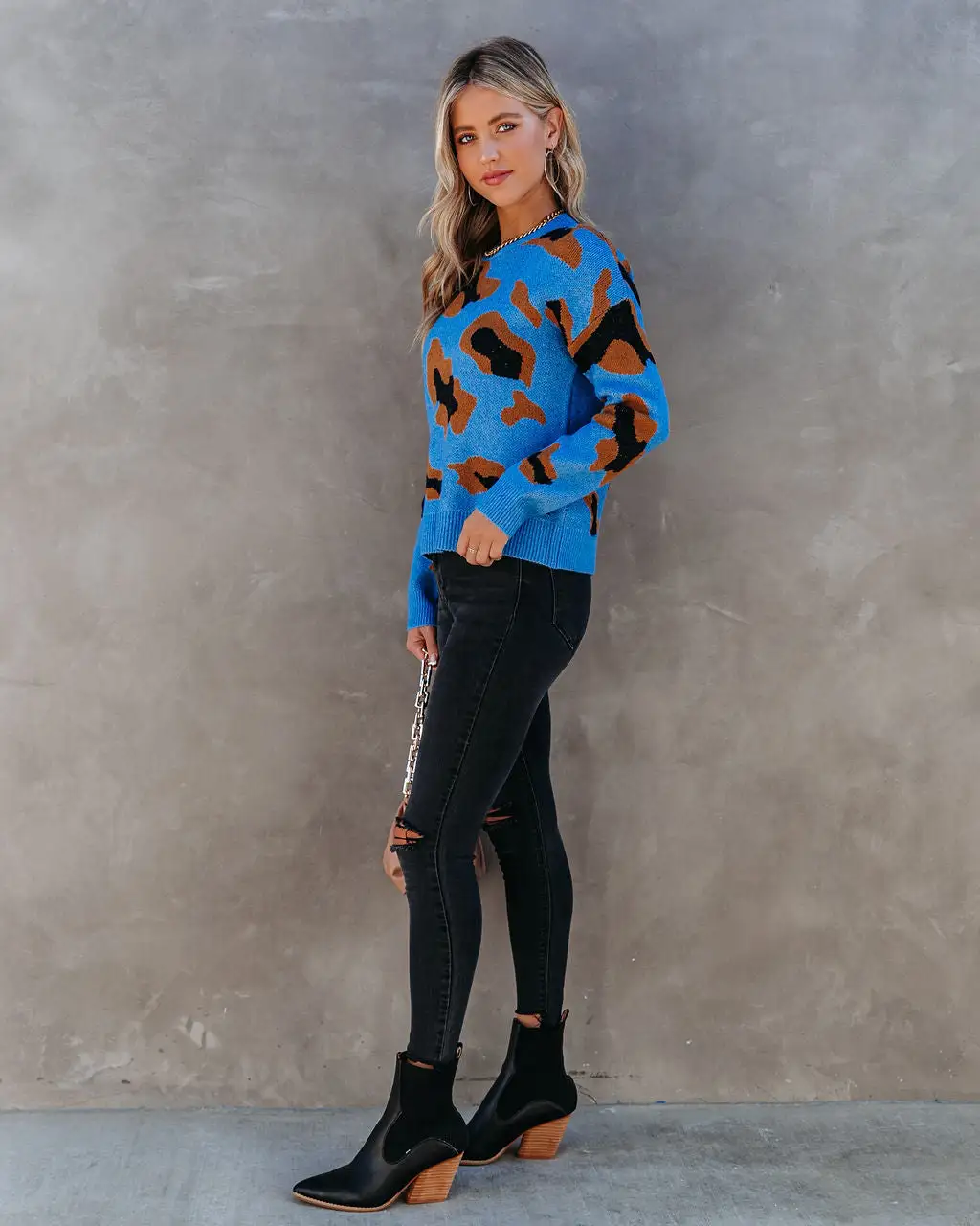 Spice up your sweater collection with our Markus Knit Leopard Sweater! This blue,black, and camel patterned sweater is perfectly relaxed. Designed with a crew neckline and long sleeves. The thick knit will keep you warm all winter long. Styled with the Perfect Hoop Earrings, Mica Chain Choker, Chic Crossbody Chain Pouch Bag, Volt High Rise Distressed Skinny, and Jocelyn Heeled Bootie.