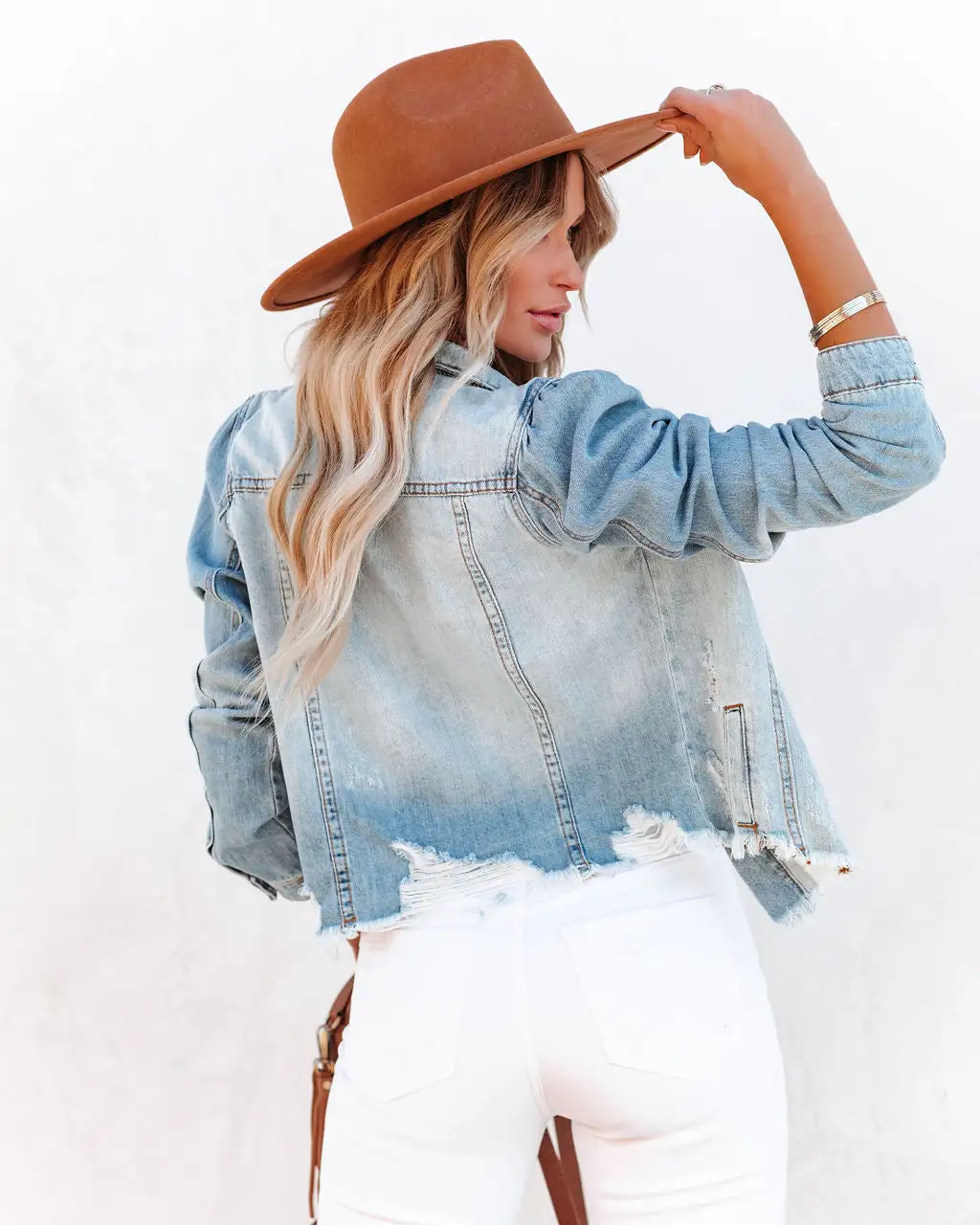 //Best Seller// Two contrasting tones of denim mix to create our Mckinney Two-Tone Distressed Denim Jacket. This light wash denim jacket has medium wash sleeves with a collar and heavy distressing. Finished with functional bust and faux side pockets with front button closures. Styled with the El Dorado Hat, Perfect Hoop Earrings, Chloe Mini Necklace, Republique Dual Pendant Necklace, Simple Bangle Bracelet, Eternal Seamless V-Neck Crop Top, Henderson High Rise Distressed Denim, Chandler Block Heeled Sandal, and Round Town Crossbody Bag.
