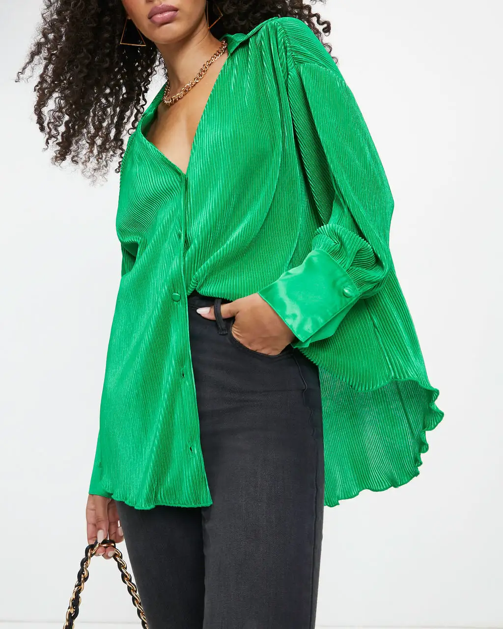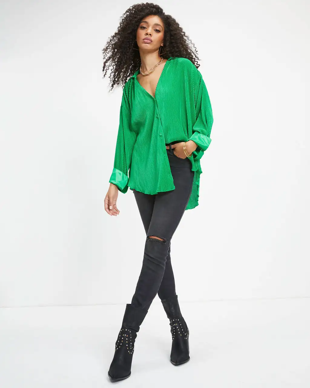 Brighten up your wardrobe in the Milan Plisse Button Down Top in emerald that features front button closures.