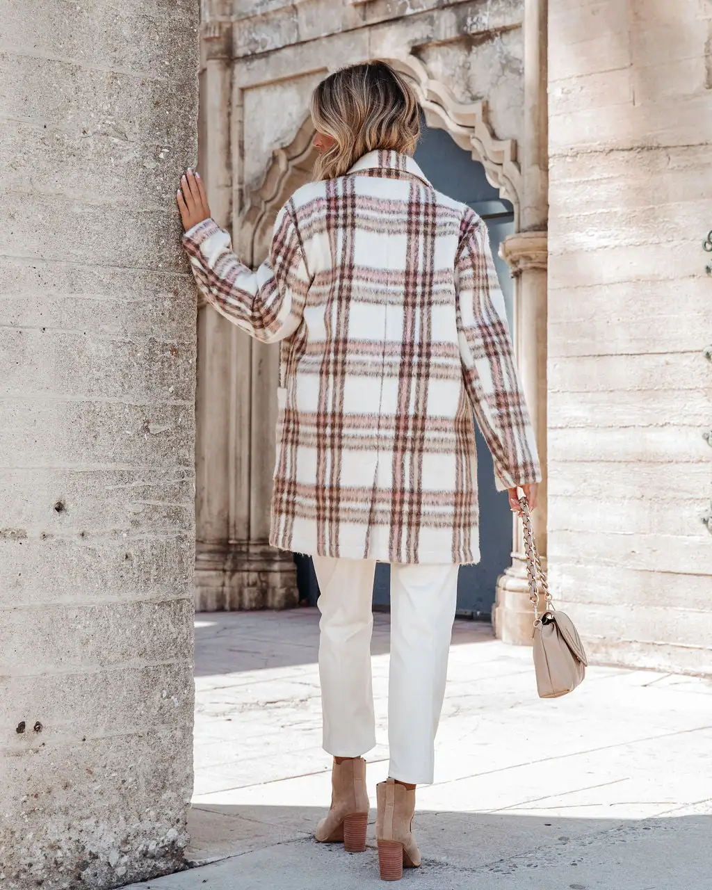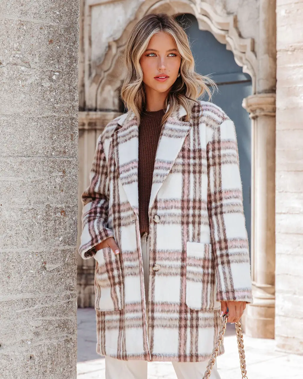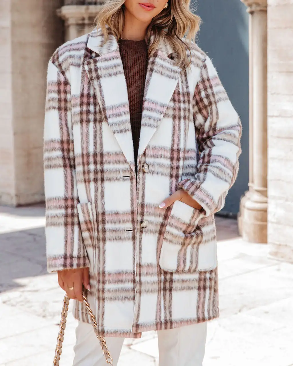 Elevate your coat collection in the Mind Your Business Pocketed Plaid Coat in beige and brown that features a notched collar.