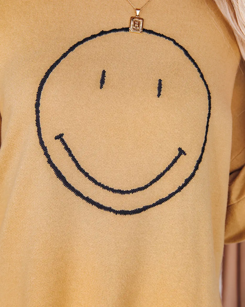 Spread some much needed cheer in our More Smiles Cotton Blend Embroidered Pullover! This mustard knit pullover has a crew neck and a raw cut hemline with a front black embroidered smiley face. Styled with the El Dorado Hat, Gabi Hoops, Cabo Chain, Initial Card Necklace, Cling Twisted Bangle Bracelet, Lennon Convertible Backpack, Kason Distressed High Rise Denim, and Uptown Faux Suede Heeled Bootie.
