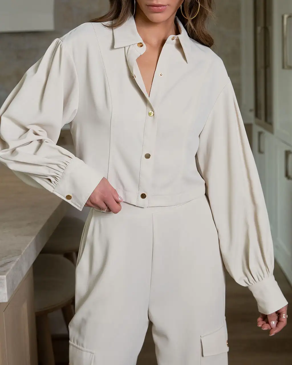 Comfy meets cool in the Eugina Snap Button Down Top in cream that features a collar.