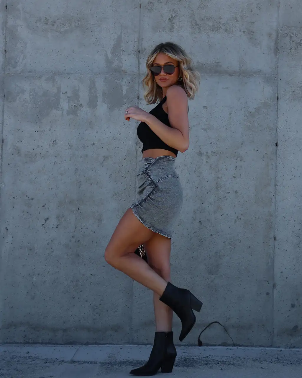 Show off your legs in the Our Prerogative Cotton Blend Mini Skirt in washed grey that features a back zipper closure.